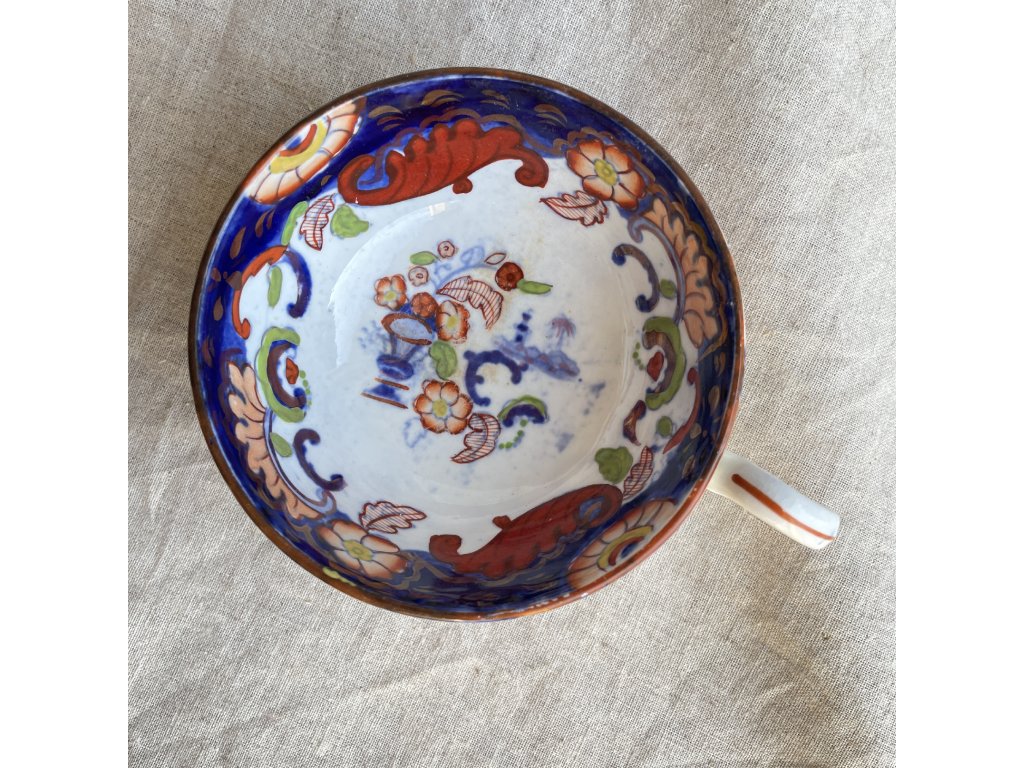 Porcelánový hrnek má výrazný dekor v bohatém barevném provedení, který na první pohled připomíná styl japonského imari porcelánu.