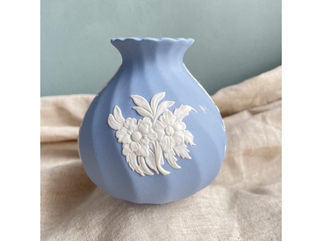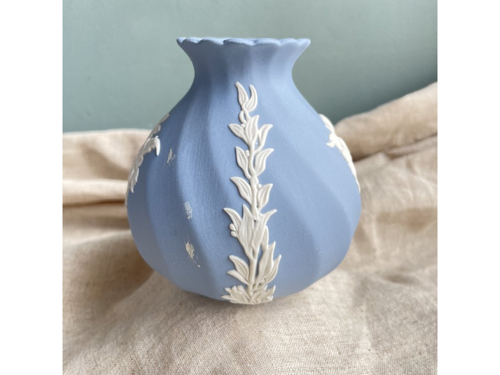 Drobná váza je vyrobena z klasického modrého jasperware porcelánu, typického pro anglickou značku Wedgwood.