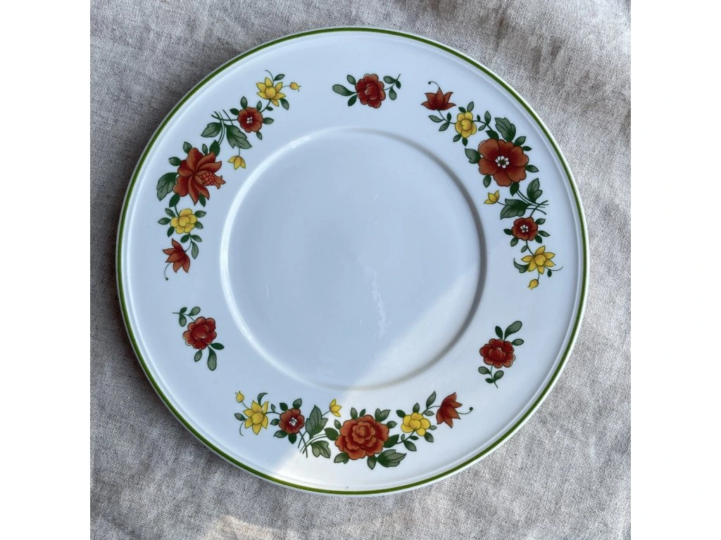 Dekor vychází z oblíbeného květinového motivu v teplých odstínech červené, žluté a zelené, který se vine kolem těla misky i po obvodu podšálku.