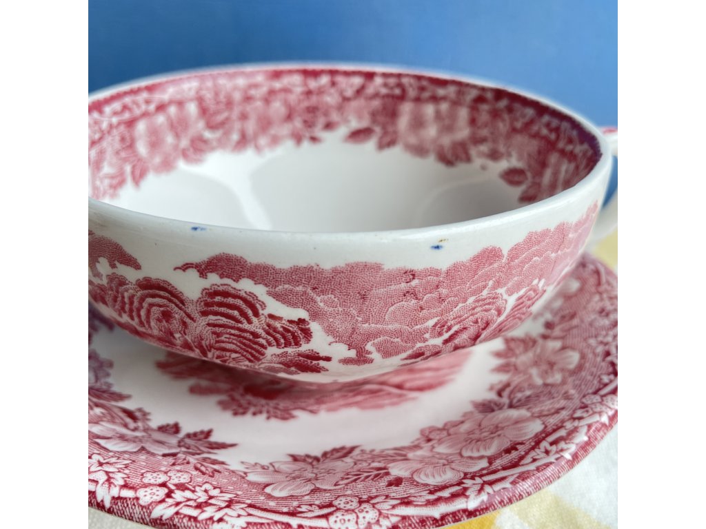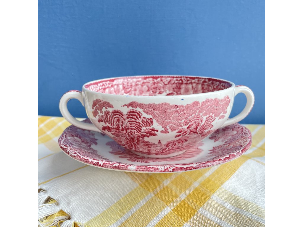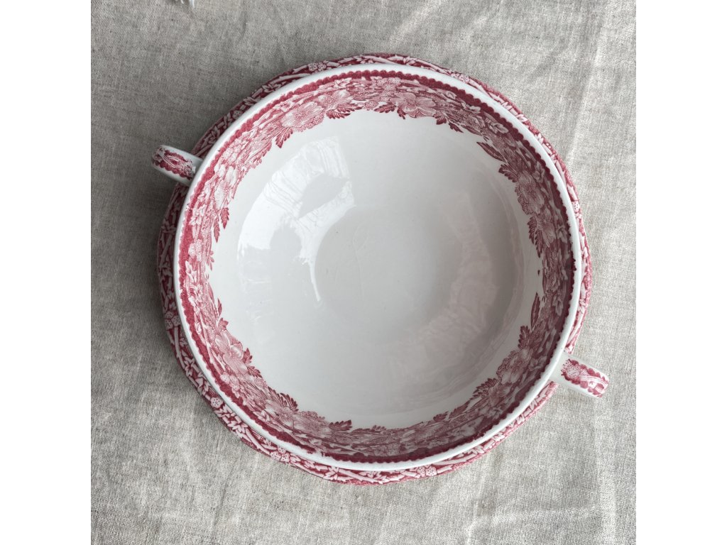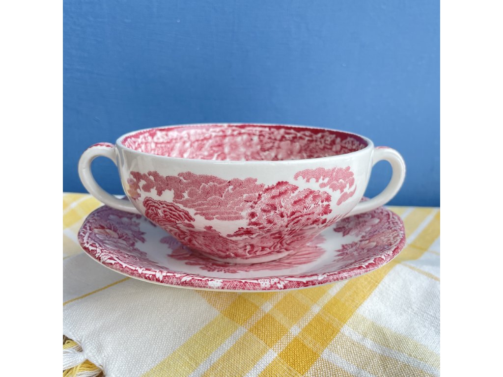 Bujónová miska s podšálkem je vyrobena z kvalitní anglické kameniny a zdobena typickým červeným transferovým tiskem ve vzoru Woodland, který patří k nejoblíbenějším dekorům tradiční britské produkce.
