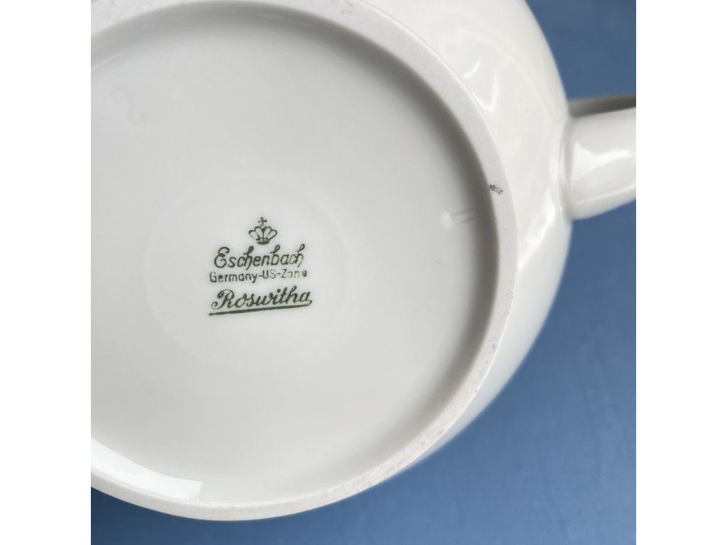 Pochází z porcelánky Eschenbach a nese název dekoru Roswitha, což datuje výrobu do poválečného období.