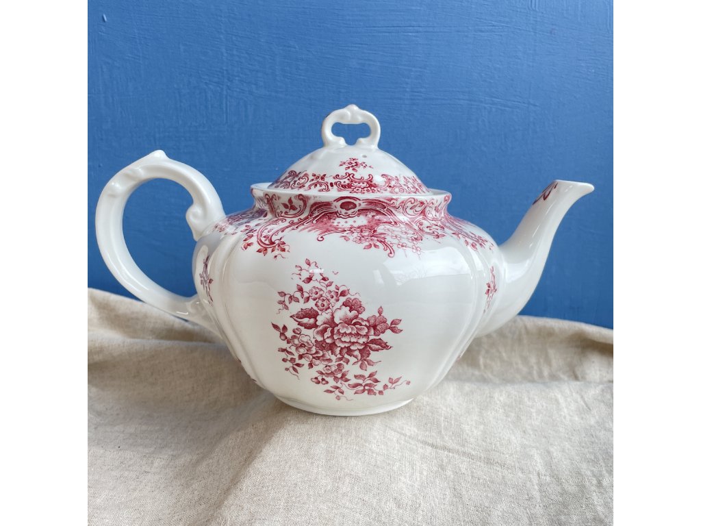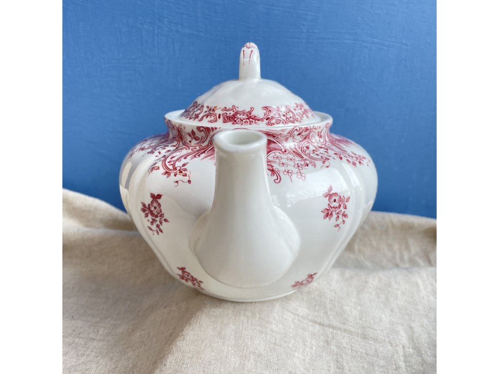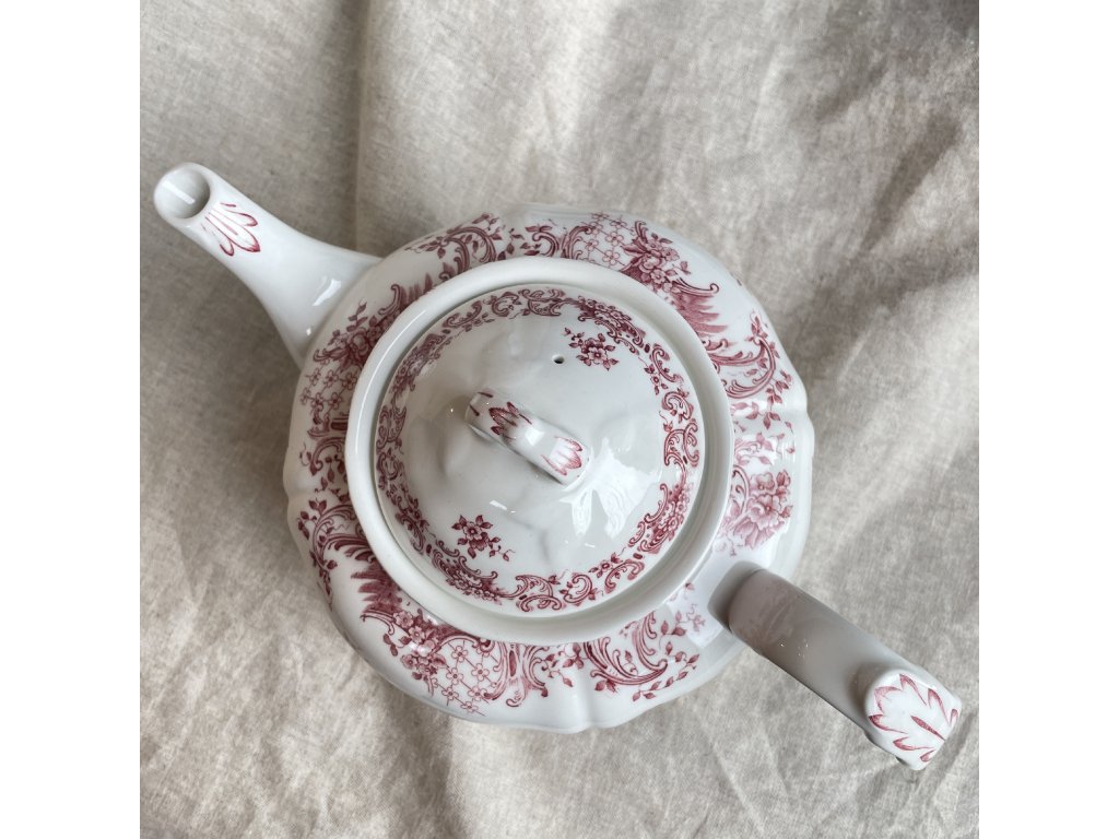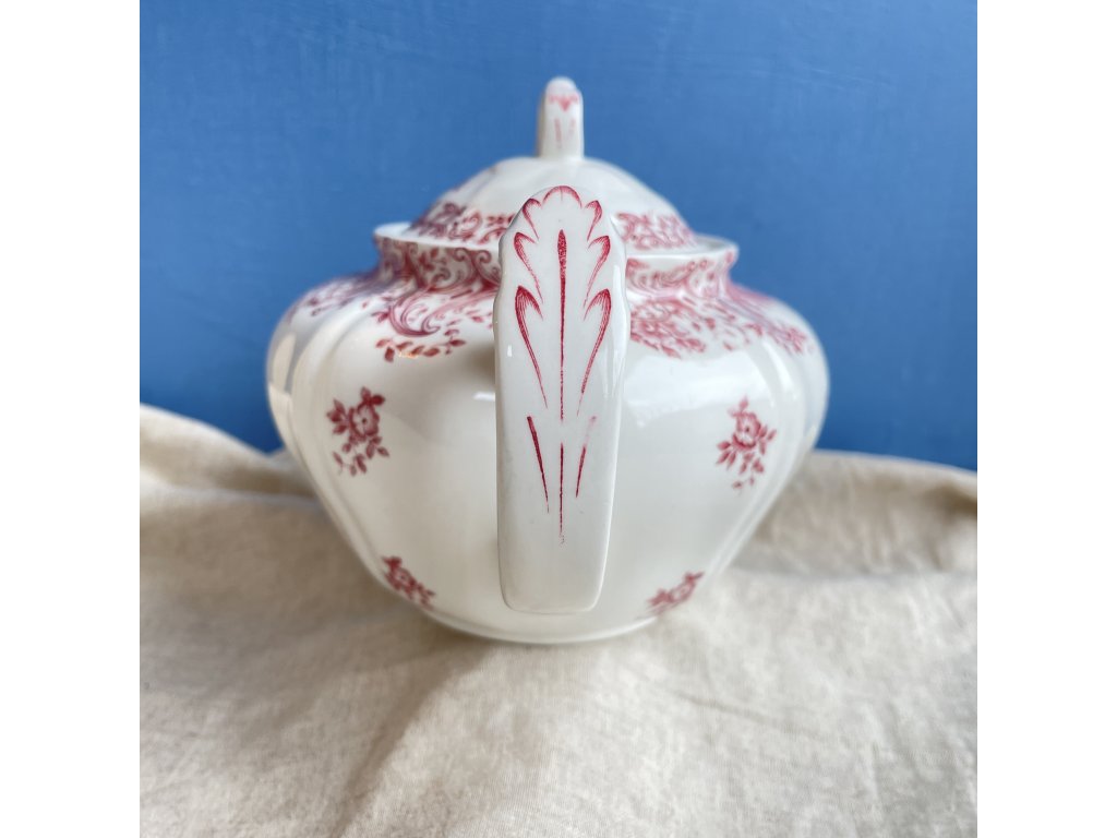 Čajová konvice je vyrobena z bílého vitroporcelánu a je zdobena bohatým červeným tiskem v historizujícím stylu, který je typický pro kvalitní evropské servisy z počátku 20. století.