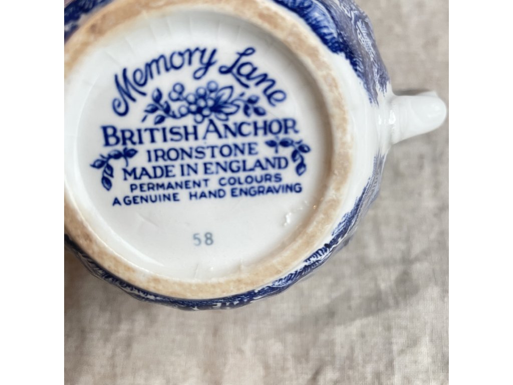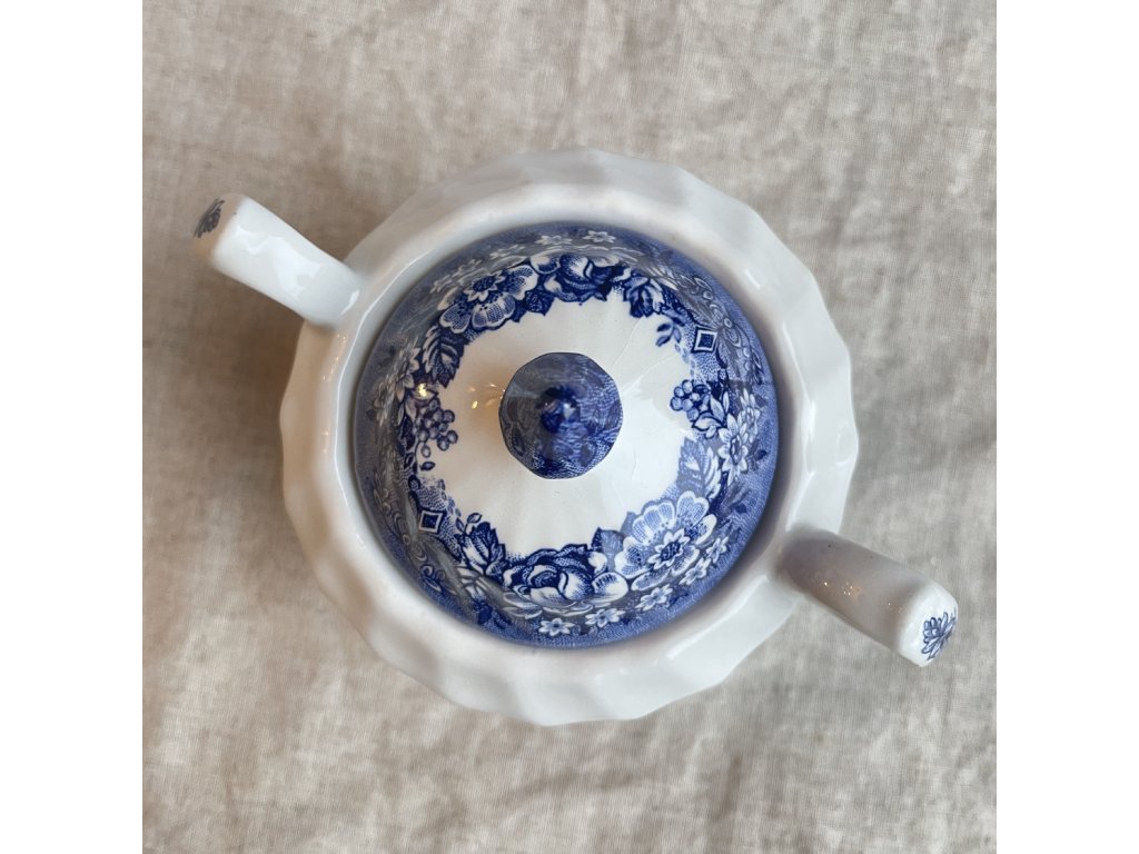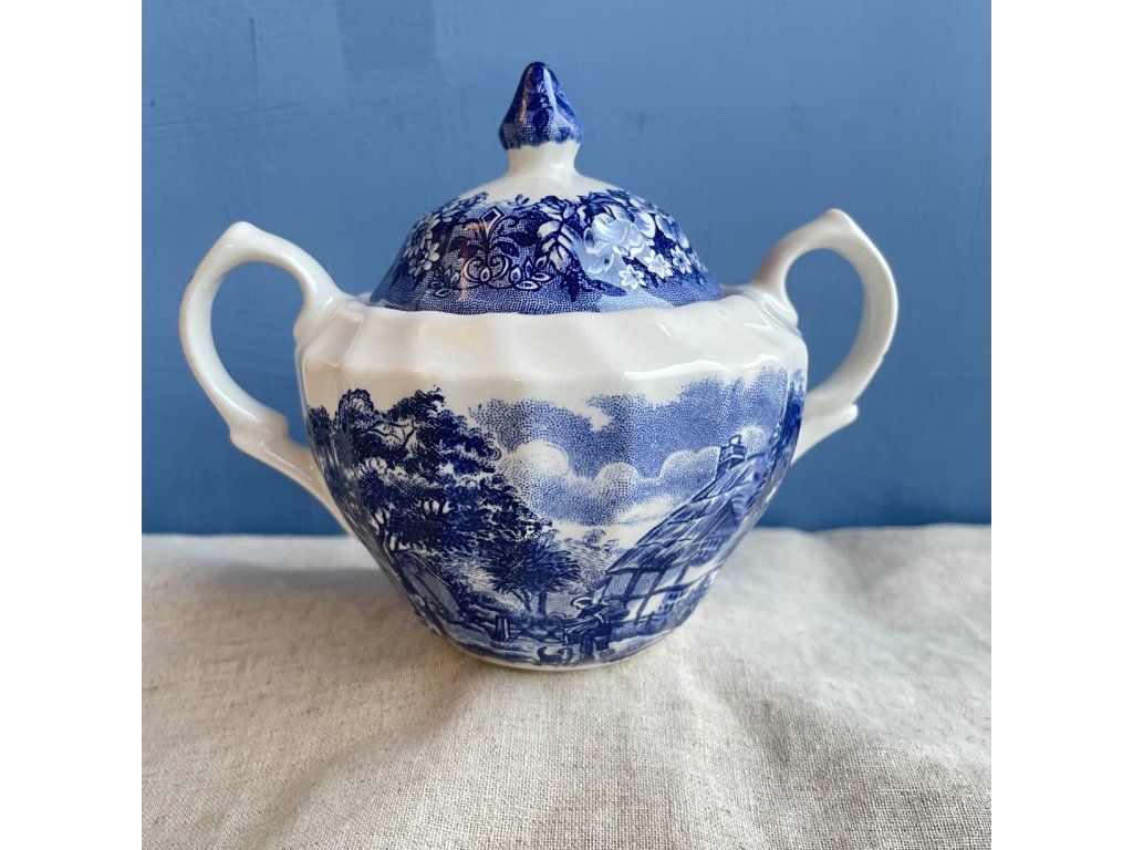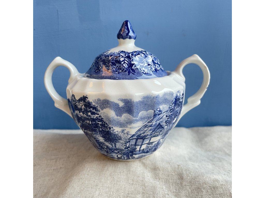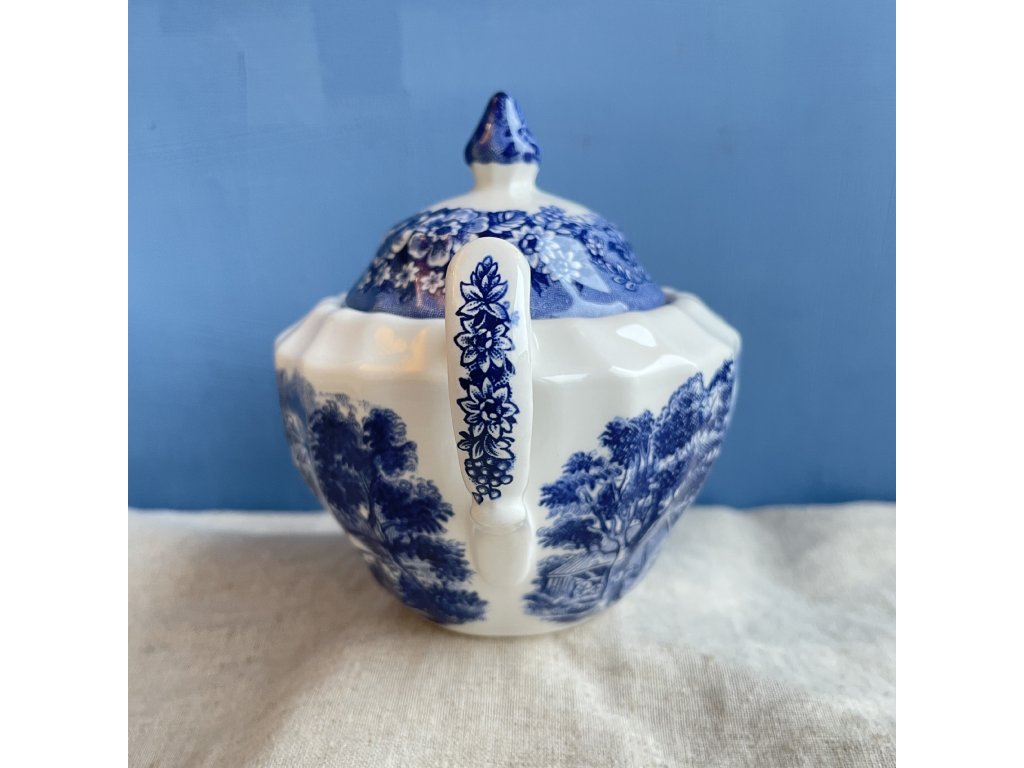 Porcelánová cukřenka s víčkem je zdobena klasickým modrobílým krajinovým dekorem Memory Lane, který navazuje na tradici anglického přenosového tisku inspirovaného venkovskými výjevy a idylickou architekturou.