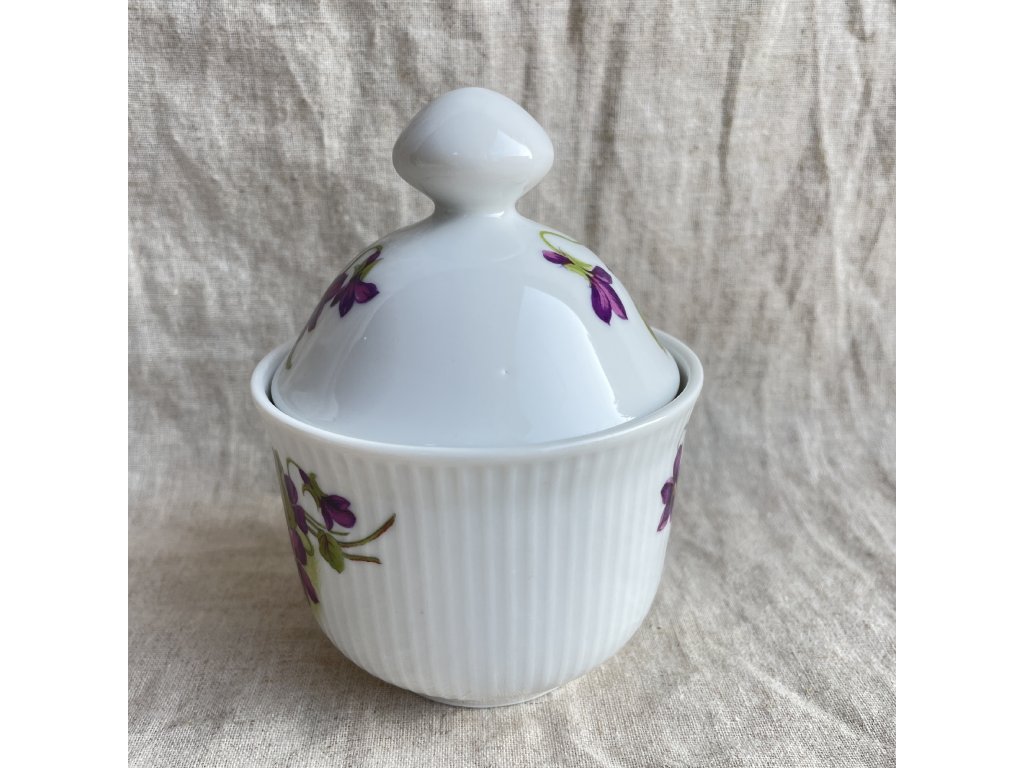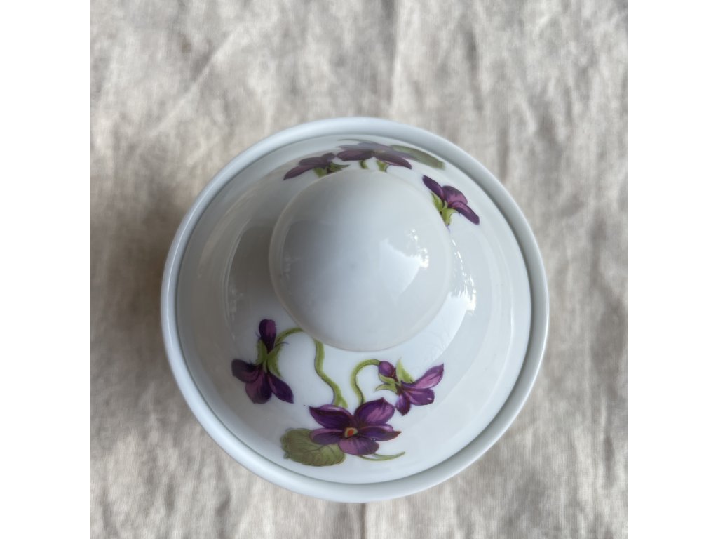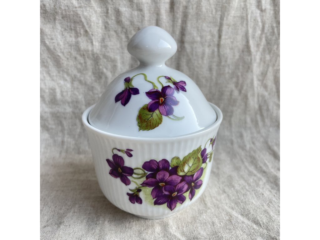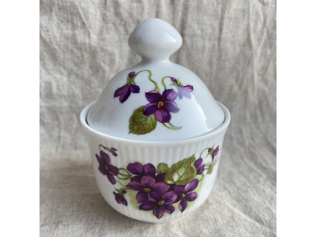 Dekor tvoří bohatý motiv fialek v odstínech fialové a purpurové doplněný zelenými listy, který se vine po obvodu cukřenky a objevuje se také na víčku.