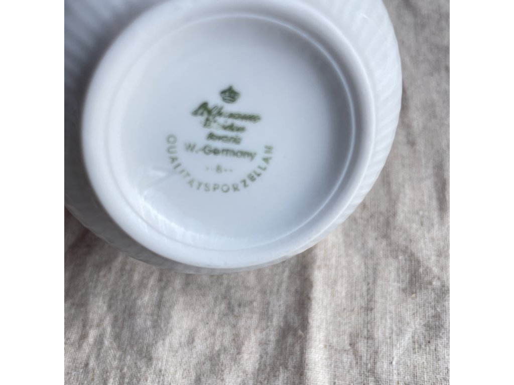 Cukřenka má klasický kompaktní tvar s mírně rozšířeným tělem a jemně plasticky rýhovaným povrchem, který dodává porcelánu elegantní strukturu.