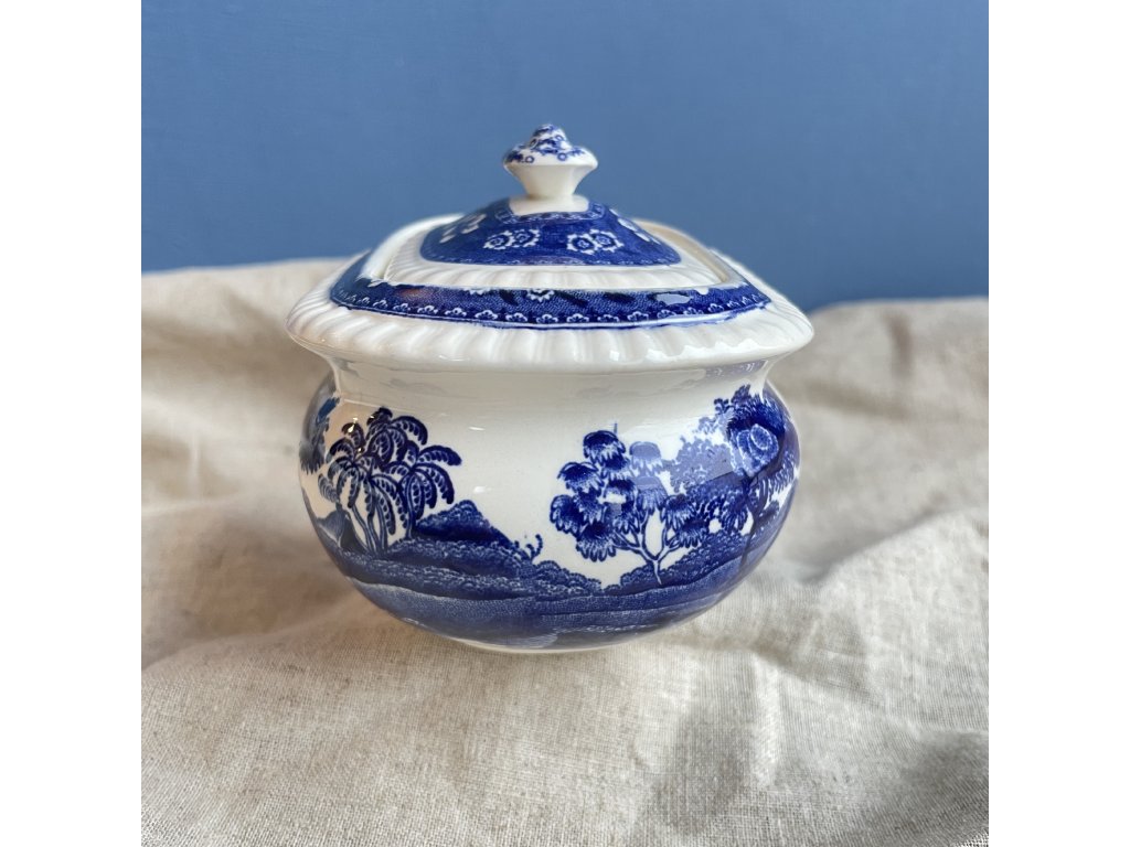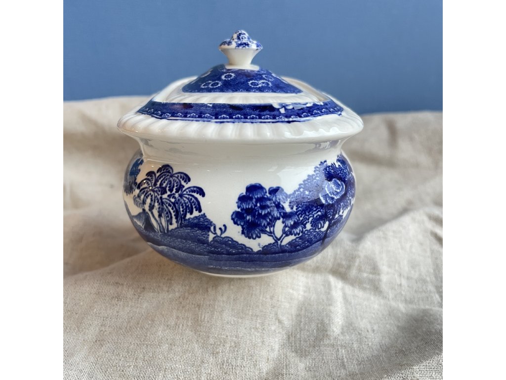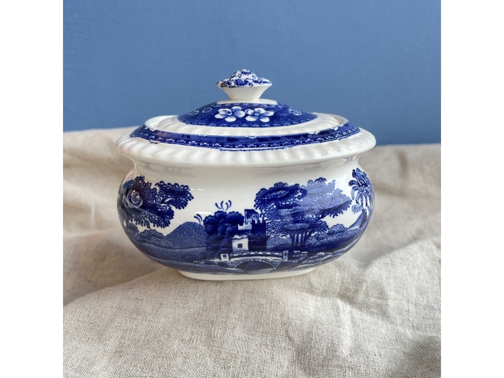 Porcelánová cukřenka s víčkem představuje klasickou anglickou keramiku z produkce značky Copeland, konkrétně v dekoru Spode’s Tower.