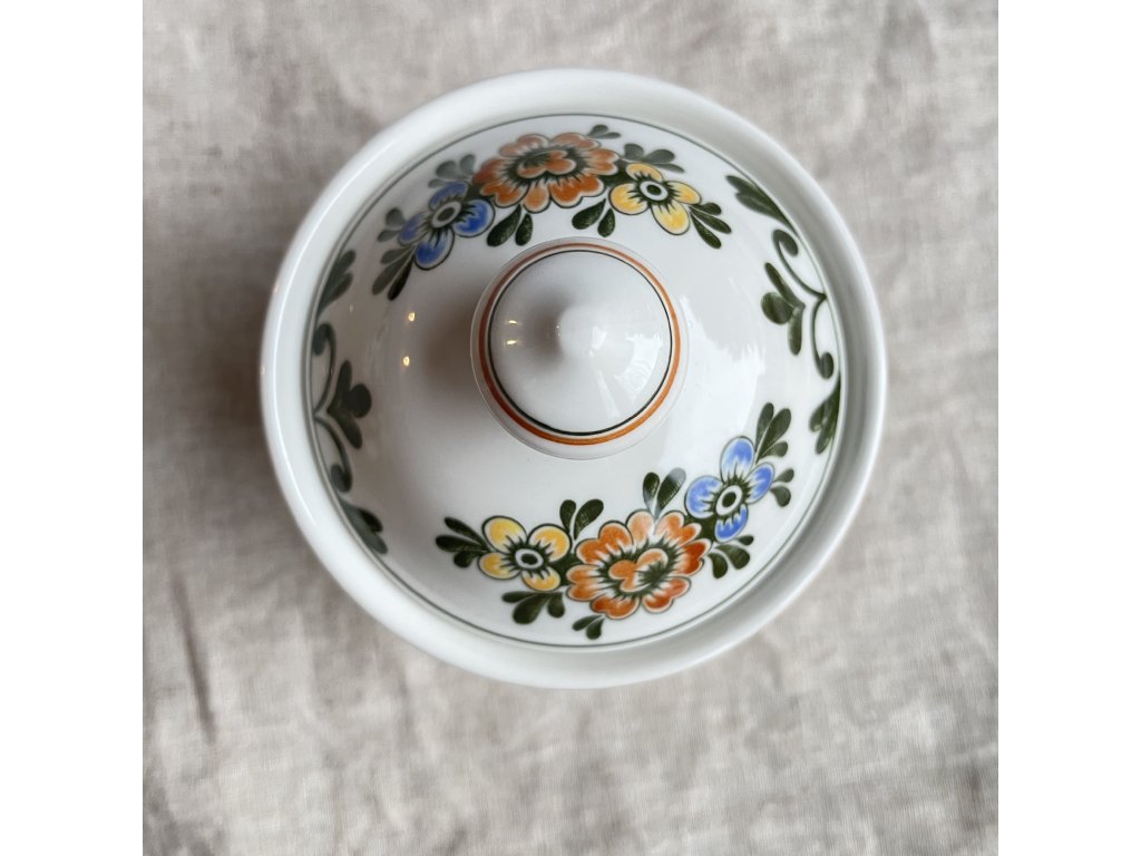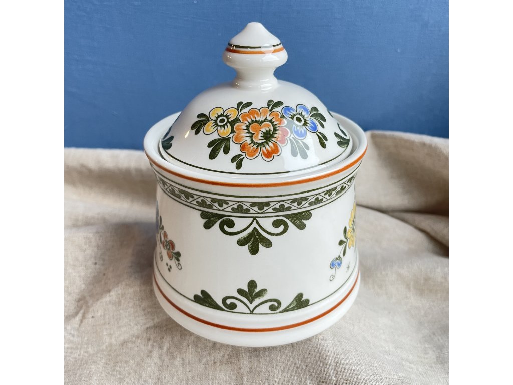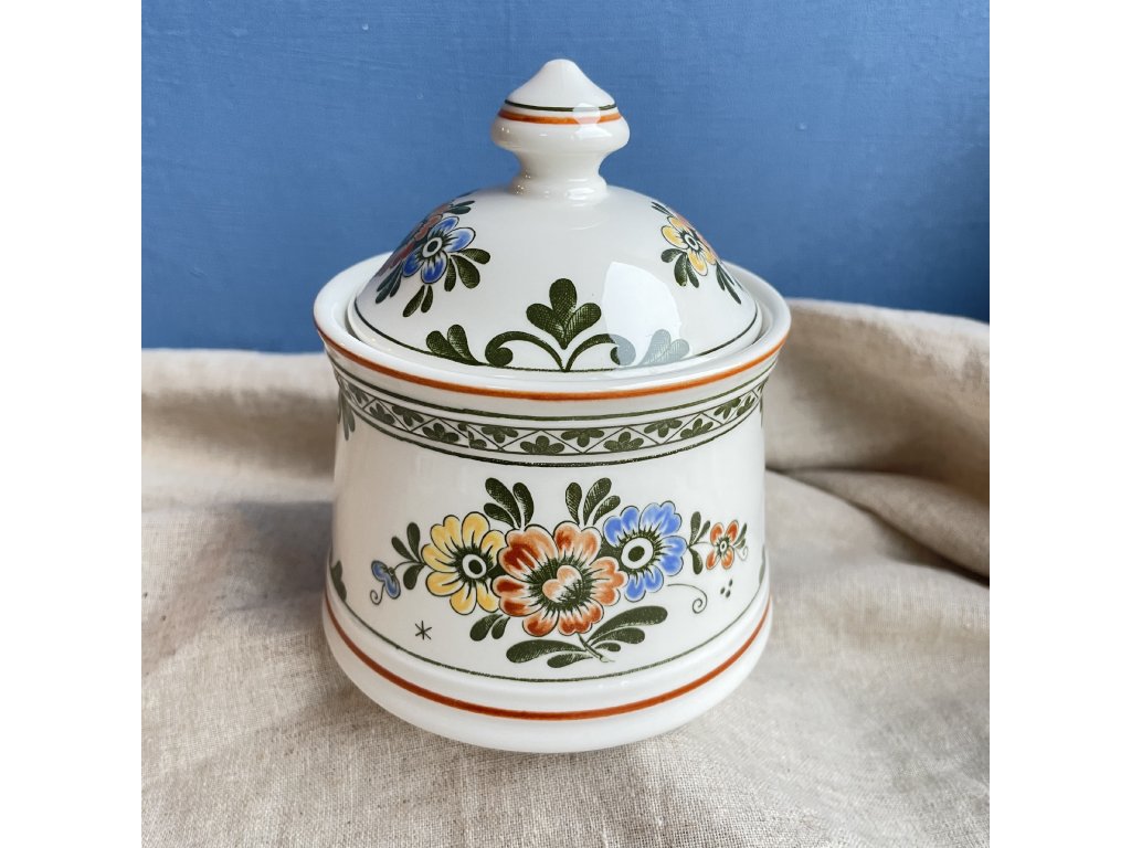 Design cukřenky je zdoben bohatým květinovým motivem v sytých barvách – oranžové, žluté, modré a zelené, s výrazným dekorem v lidovém stylu, který připomíná nizozemský či středoevropský folklór.