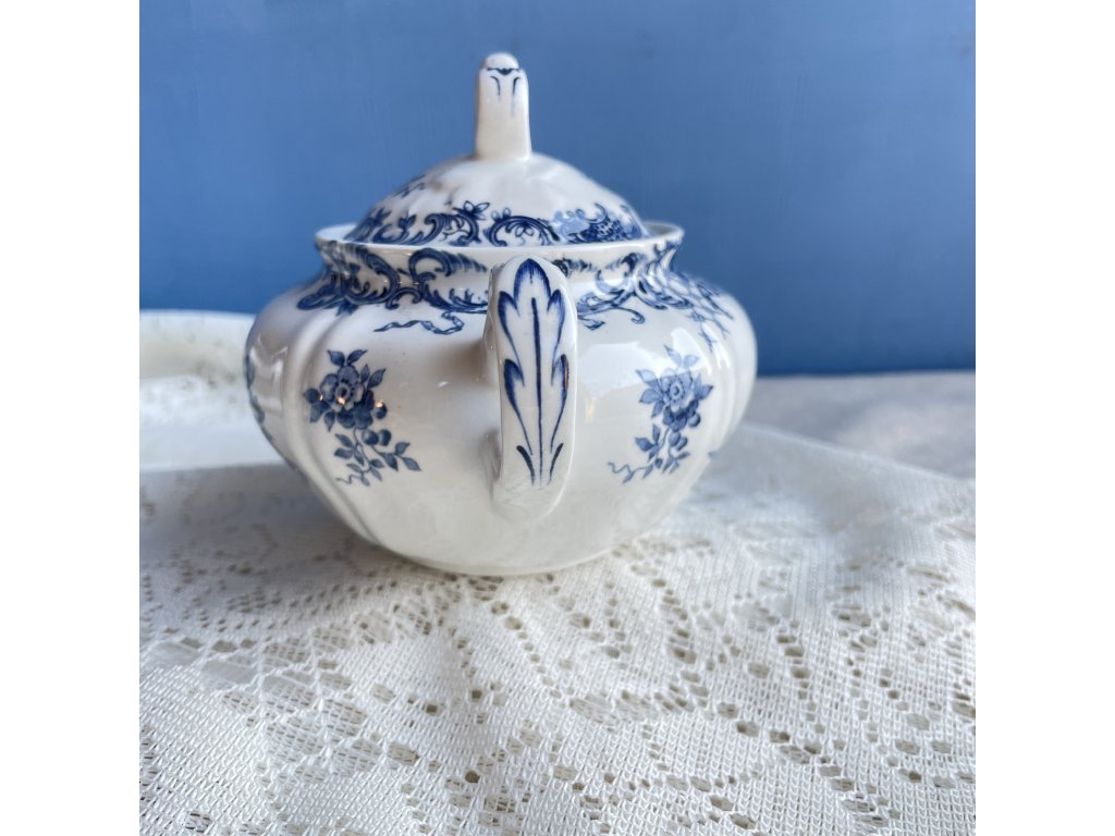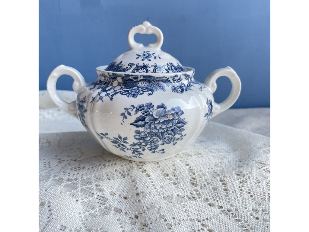 Cukřenka z kolekce Valeria značky Villeroy & Boch, vyrobená v Německu z vysoce kvalitního vitro-porcelánu, nese elegantní modrobílý dekor inspirovaný klasickými květinovými a rokokovými motivy.