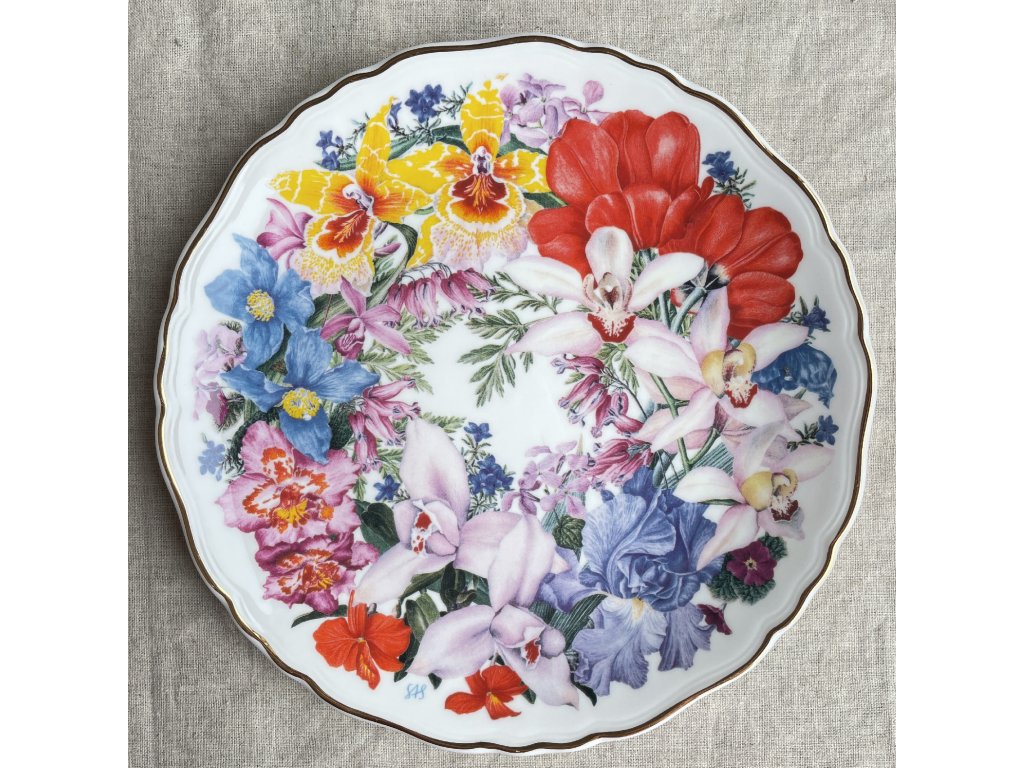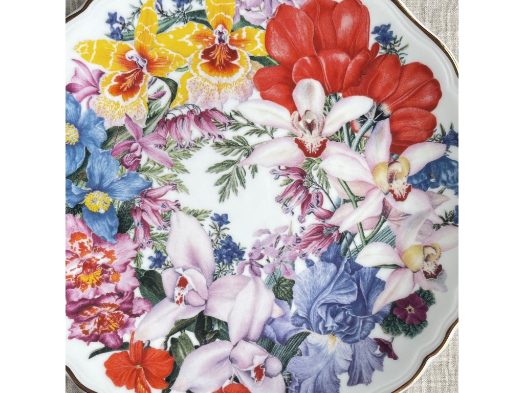 Přední strana talíře je zdobena výjimečně barevnou a bohatou květinovou kompozicí s důrazem na exotické a výrazné květy, zejména různé druhy orchidejí.
