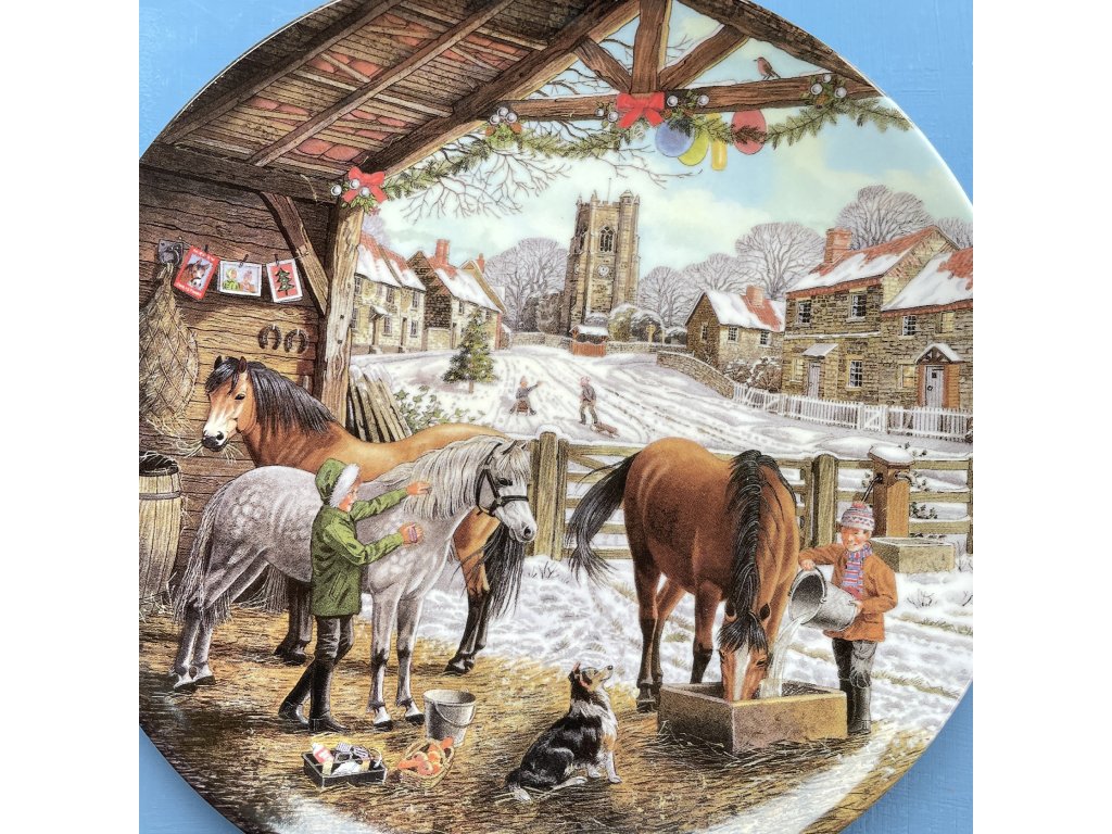 Dekorační porcelánový talíř nese zimní venkovský výjev s vánoční atmosférou, zachycený jako pohled do stáje, kde dvě děti pečují o koně.