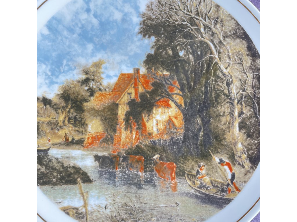 Dekorativní porcelánový talíř zobrazuje venkovskou krajinu s řekou, mlýnem a červeně tónovanými domky, jejichž odraz se klidně zrcadlí ve vodní hladině.