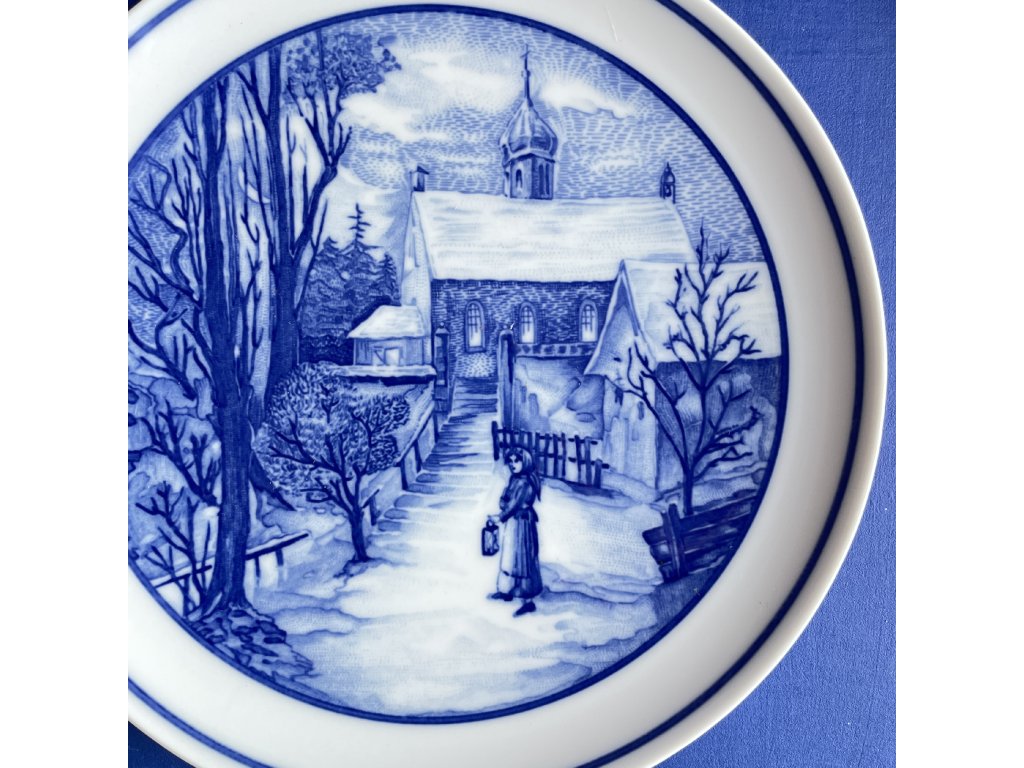 Výjev na talíři je proveden v jemné modrobílé podglazurní malbě, typické pro vánoční a zimní edice této značky.