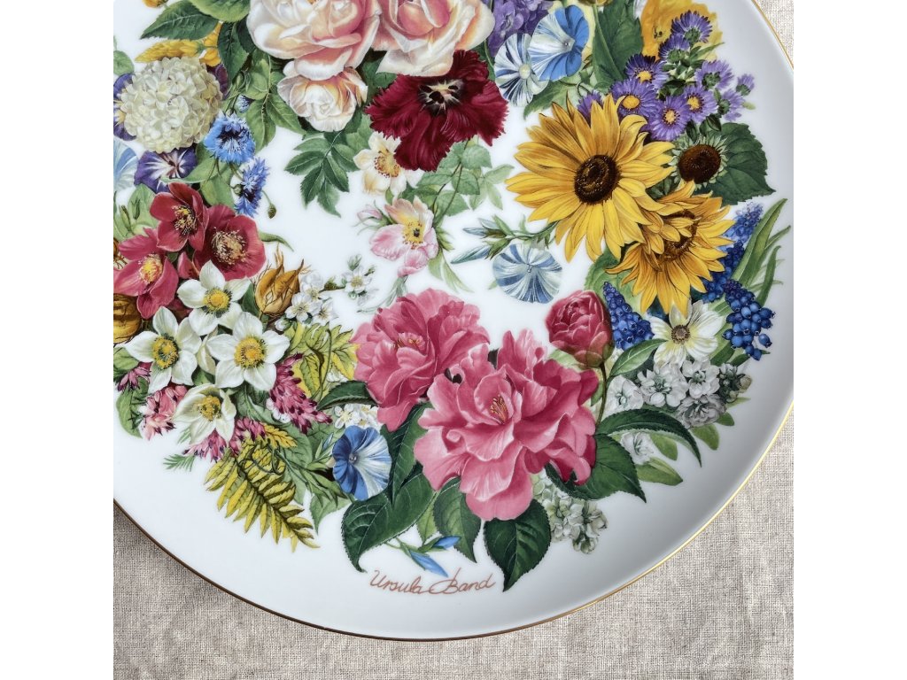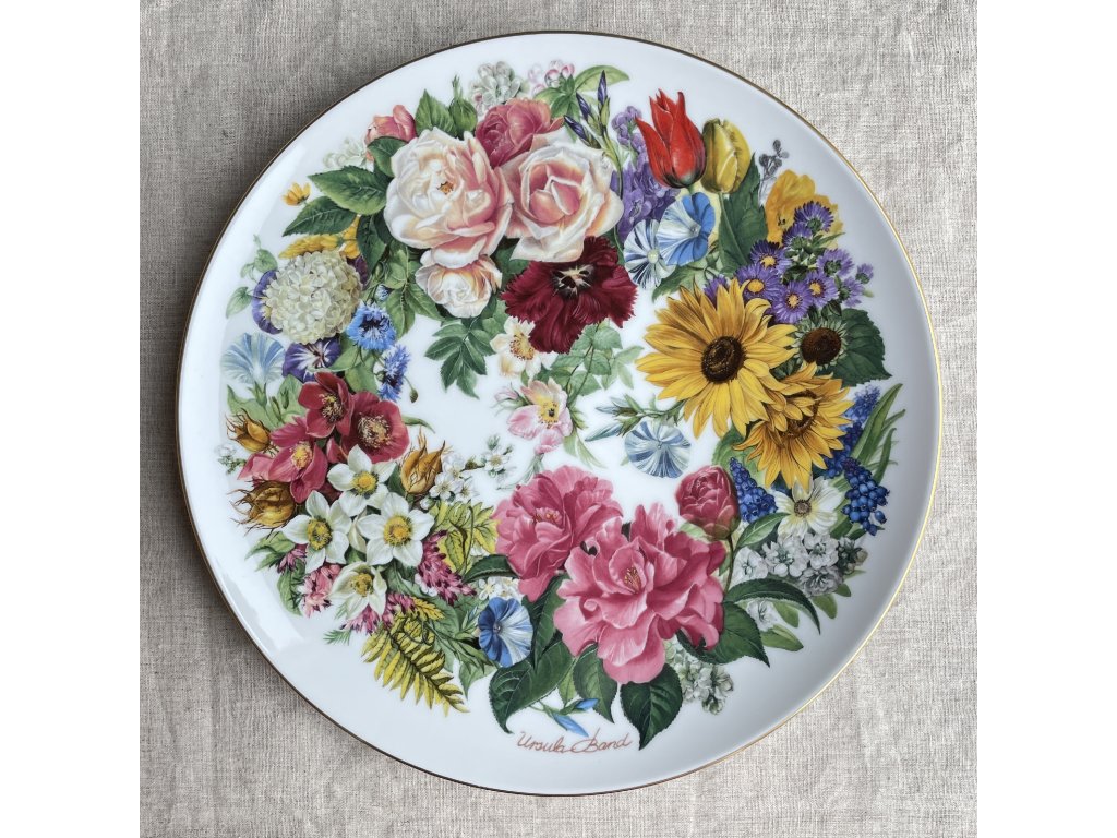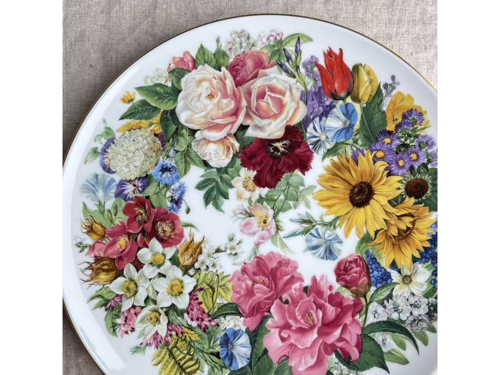 Dekor na přední straně talíře tvoří mimořádně bohatá a detailní kompozice pestrých květin.