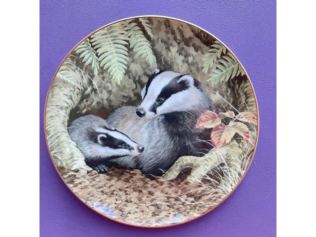 Motiv s názvem Badgers nestle under June Ferns zobrazuje jezevce s mládětem ukryté v podzemním doupěti pod kapradinami na počátku léta.