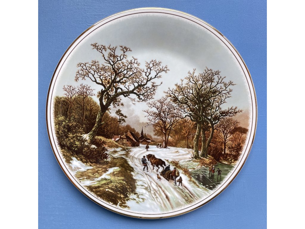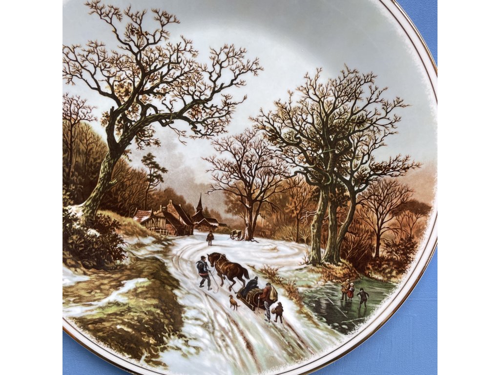 Scéna na talíři představuje typickou zimní venkovskou krajinu podle Koekkoekovy předlohy – klikatou cestu pokrytou sněhem, po níž jede selský vůz tažený koňmi, doprovázený postavami dětí a vesničanů.