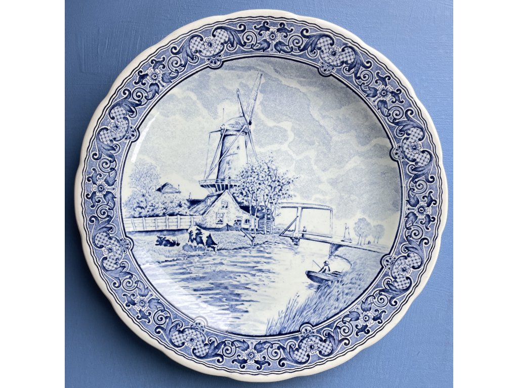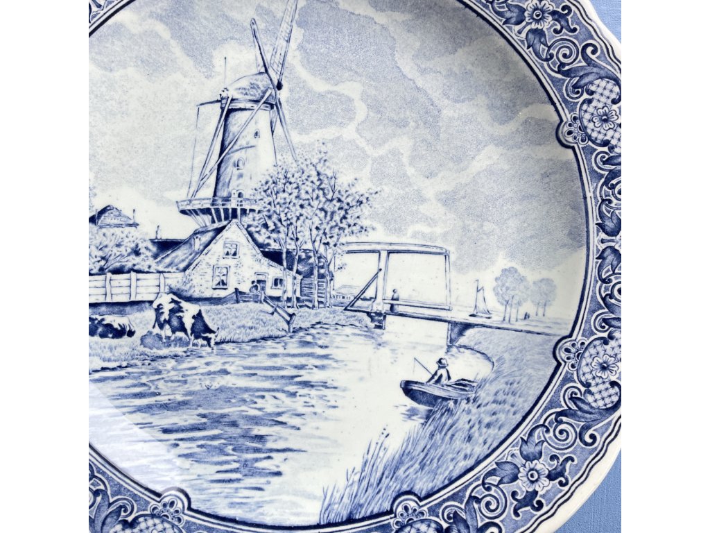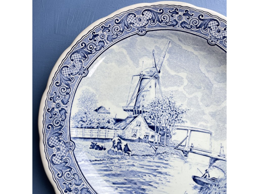 Dekorativní porcelánový talíř zobrazuje tradiční nizozemskou scenérii s větrným mlýnem, farmářským stavením, kravami a mužem v loďce na řece.
