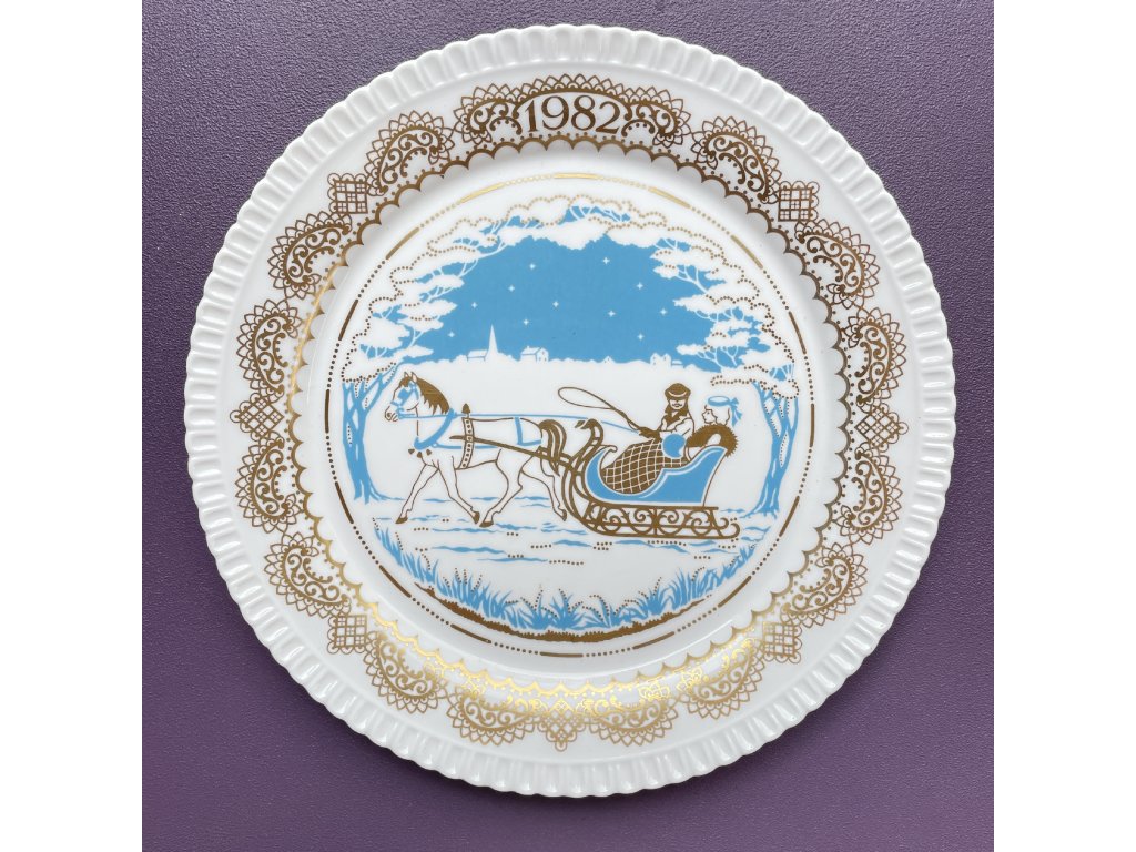 Tento porcelánový talíř z roku 1982 pochází z vánoční sběratelské edice Christmas Pastimes a nese název „Sleigh Ride“ (jízda na saních).