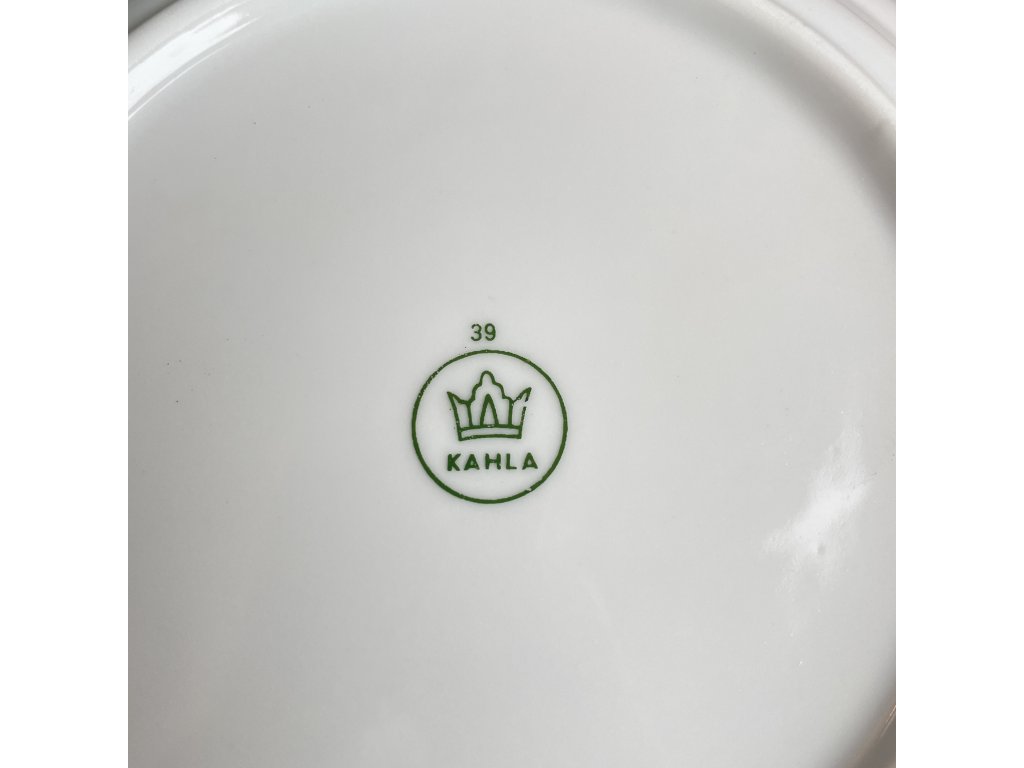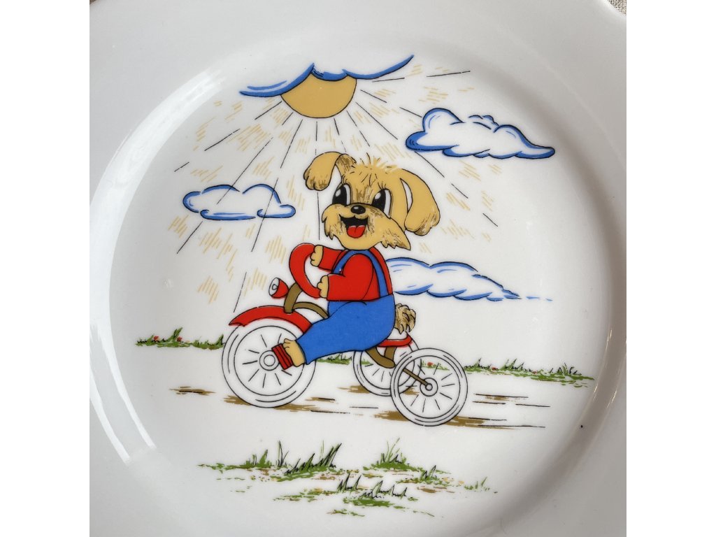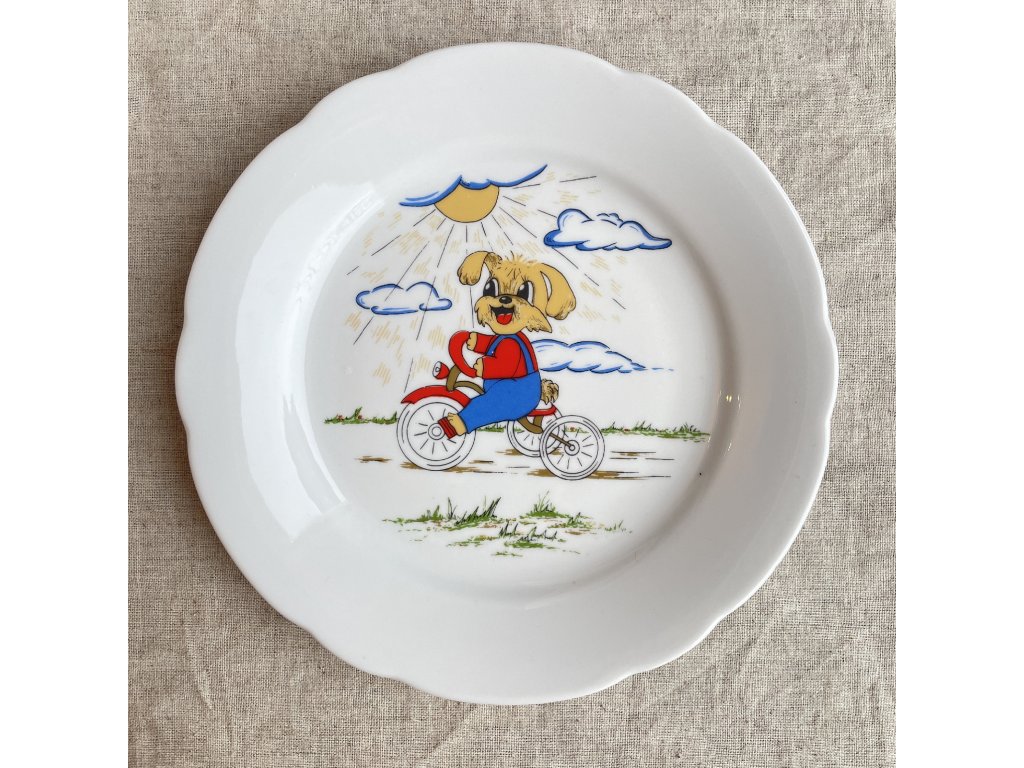 Dětský porcelánový talířek značky Kahla je zdoben veselým motivem pejska jedoucího na kole pod slunečnou oblohou s obláčky.