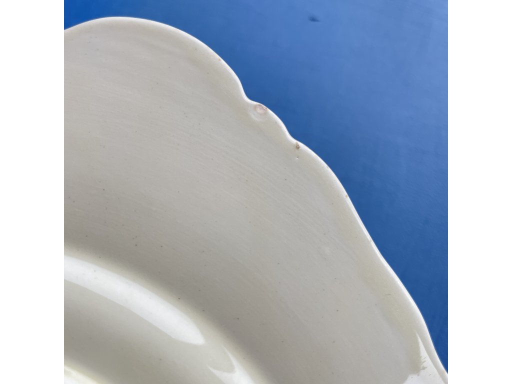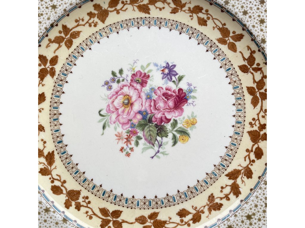 Dezertní talíř je vyroben z anglické kameniny a nese typické znaky kvalitní produkce přelomu 19. a 20. století.