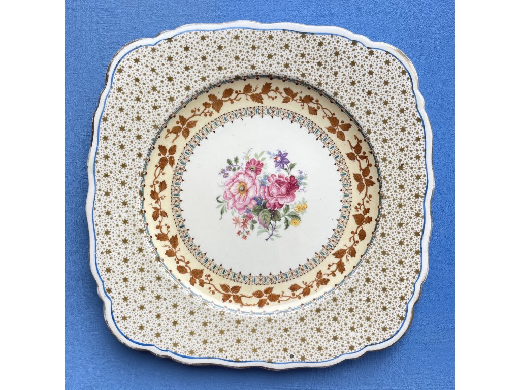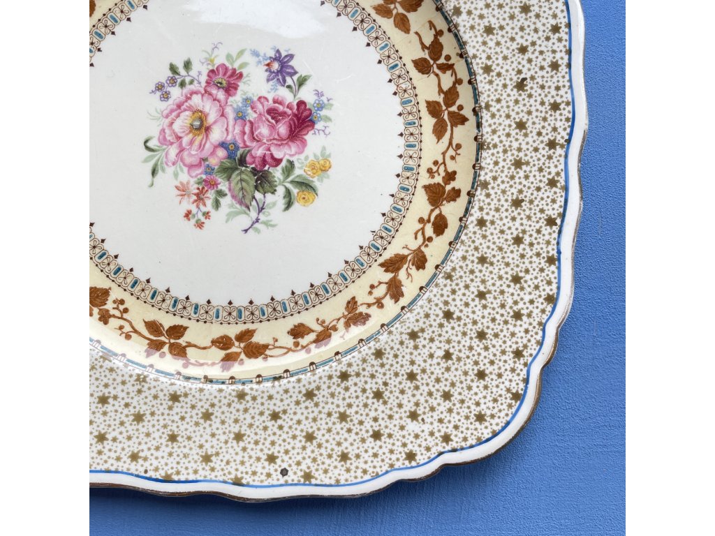 Rozměry 20,5 x 20,5 cm. Talíř má lehké škrábnutí na glazuře a malý oťuk na hraně.