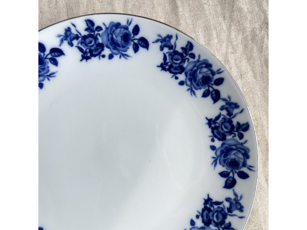 Po obvodu talíře se nachází pravidelně rozmístěný motiv stylizovaných růží a drobných květů s listy, které vytvářejí elegantní dekorativní věnec kolem hladkého středu.