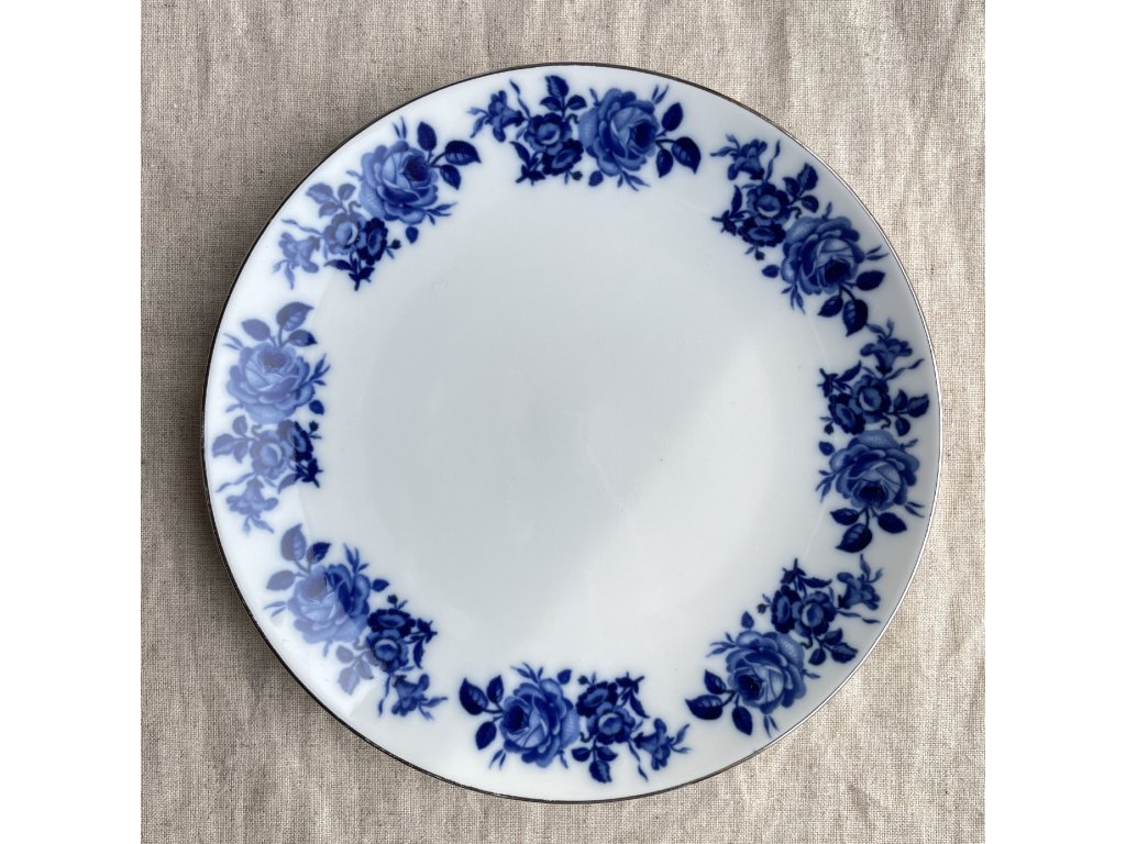 Porcelánový dezertní talíř je zdoben jemným květinovým dekorem v odstínech kobaltově modré.
