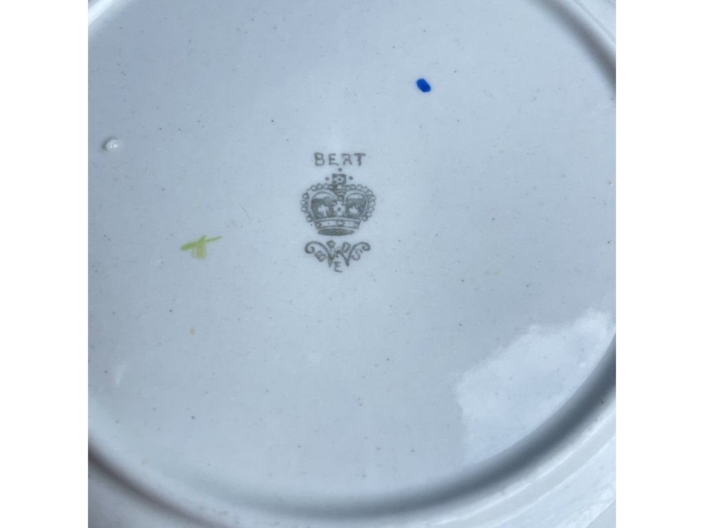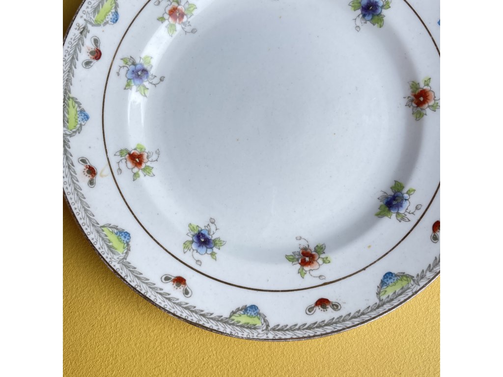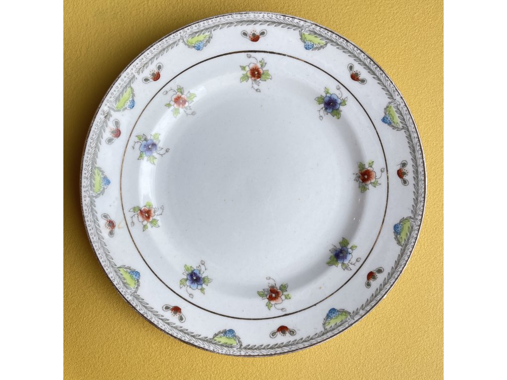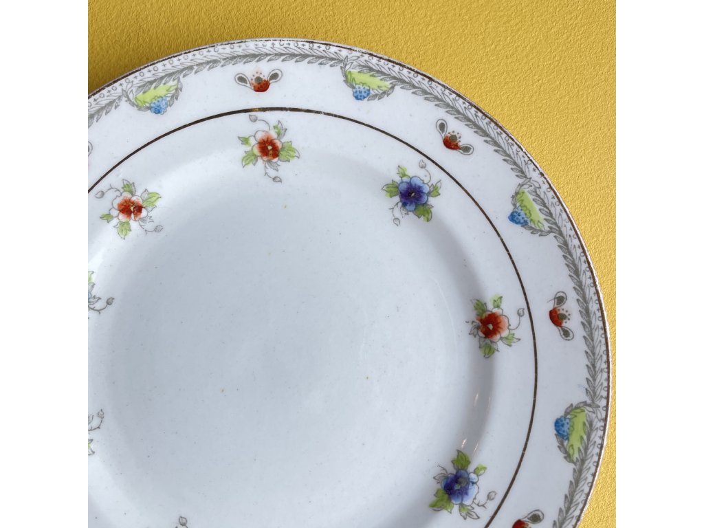 Porcelánový dezertní talíř zbobený po okraji - na lemu se střídají drobné stylizované květy v červených a modrofialových odstínech s jemnými zelenými lístky, doplněné šedou ornamentální bordurou s motivem věnečku.