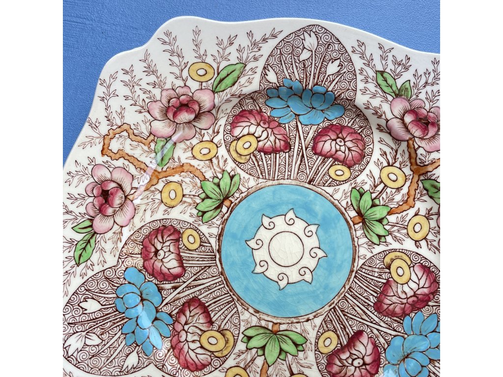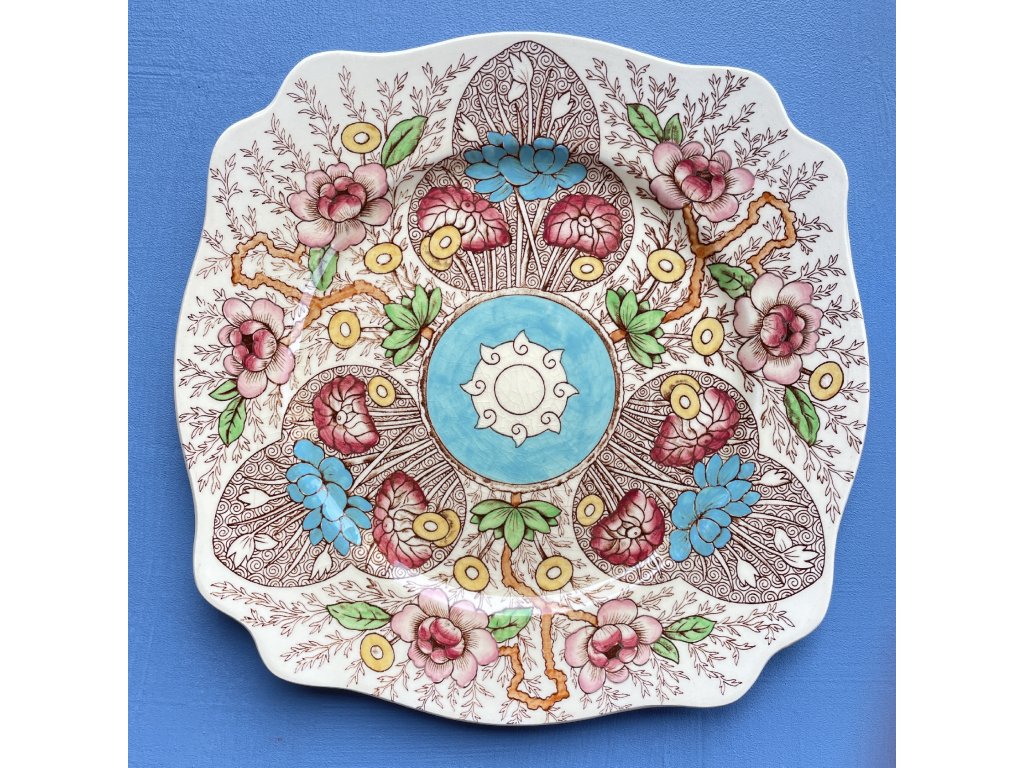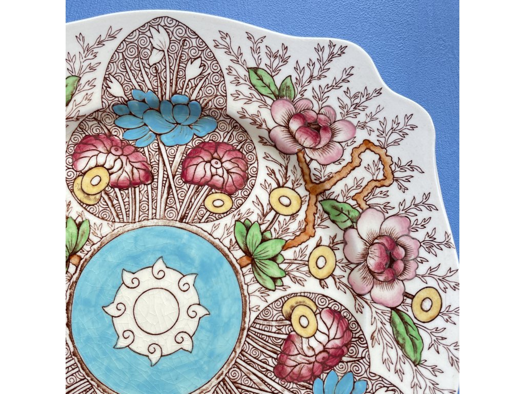 Ve středu talíře se nachází výrazný tyrkysově modrý kruh s drobným stylizovaným motivem, od kterého se do všech stran rozvíjejí dekorativní pole vyplněná květinami v růžových, modrých a žlutých odstínech. Jemná hnědá linková kresba, spirálové vzory a stylizované větvičky dodávají dekoru hloubku a lehce orientální nádech.
