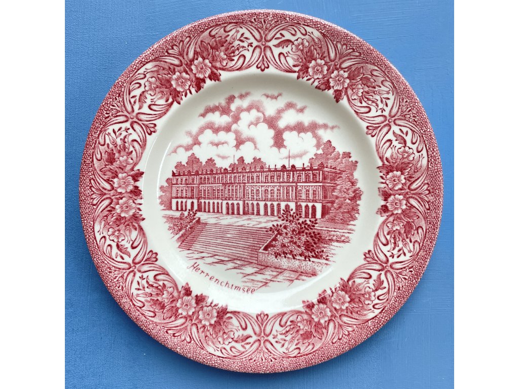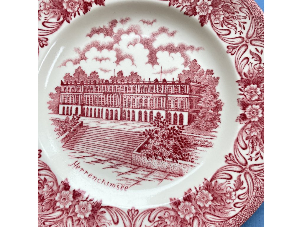 Dezertní talíř s motivem zámku Herrenchiemsee je vyveden v sytě červené přenosové dekoraci, která elegantně kombinuje bohatý květinový lem s centrálním motivem.