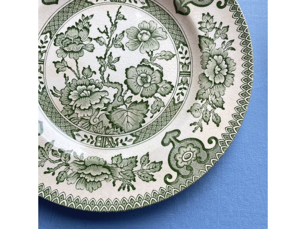 Dezertní talíř z bílého ironstonu s výrazným zeleným dekorem v tradičním stylu inspirovaném historickými anglickými vzory.