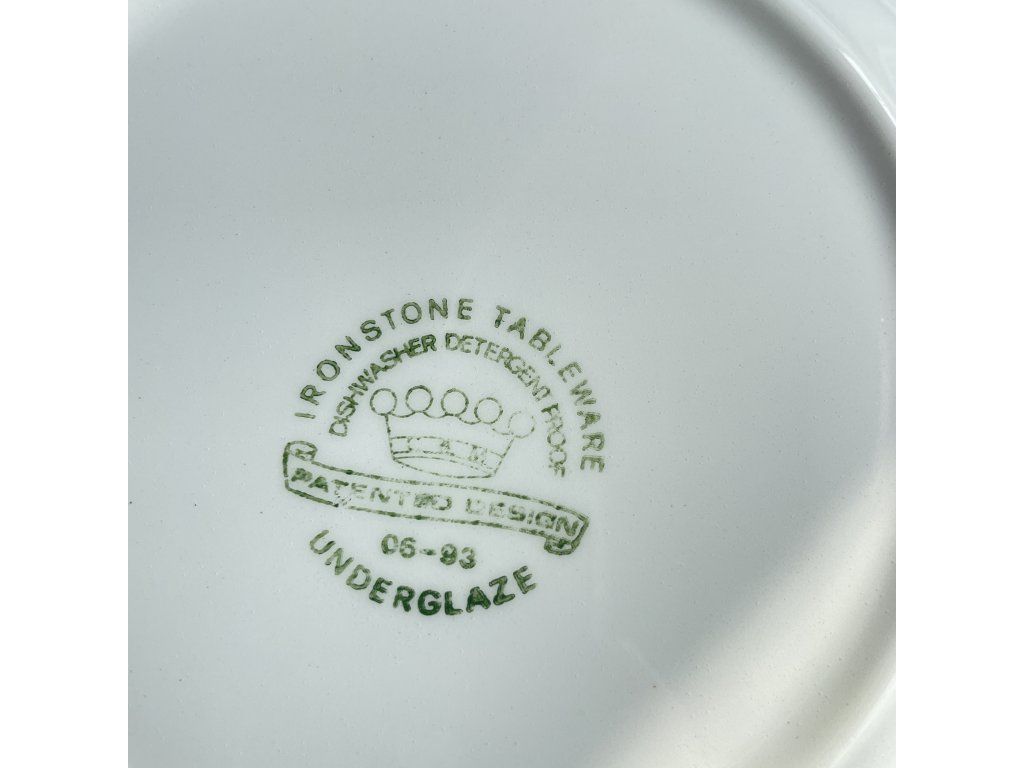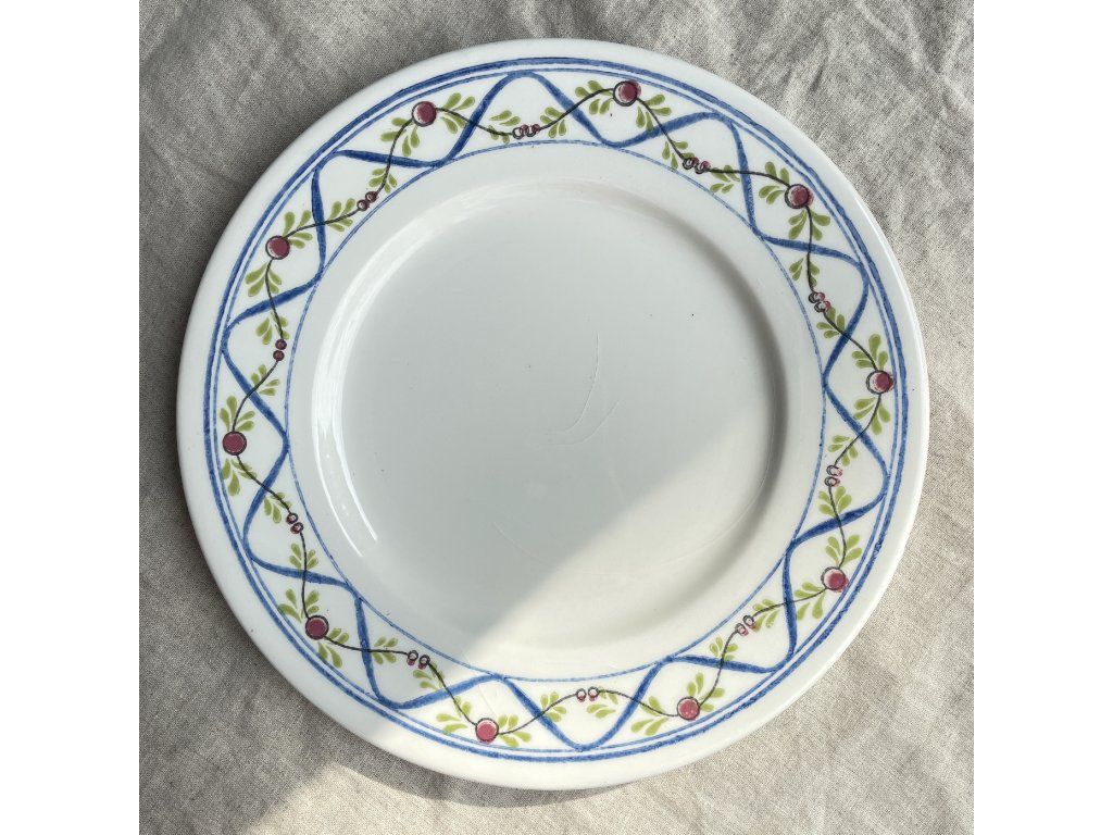 Okraj talíře nese jemný, ručně působící dekor – modrá vlnovka vytváří pravidelný rytmus, který je doplněn drobnými zelenými lístky a červenými bobulkami.