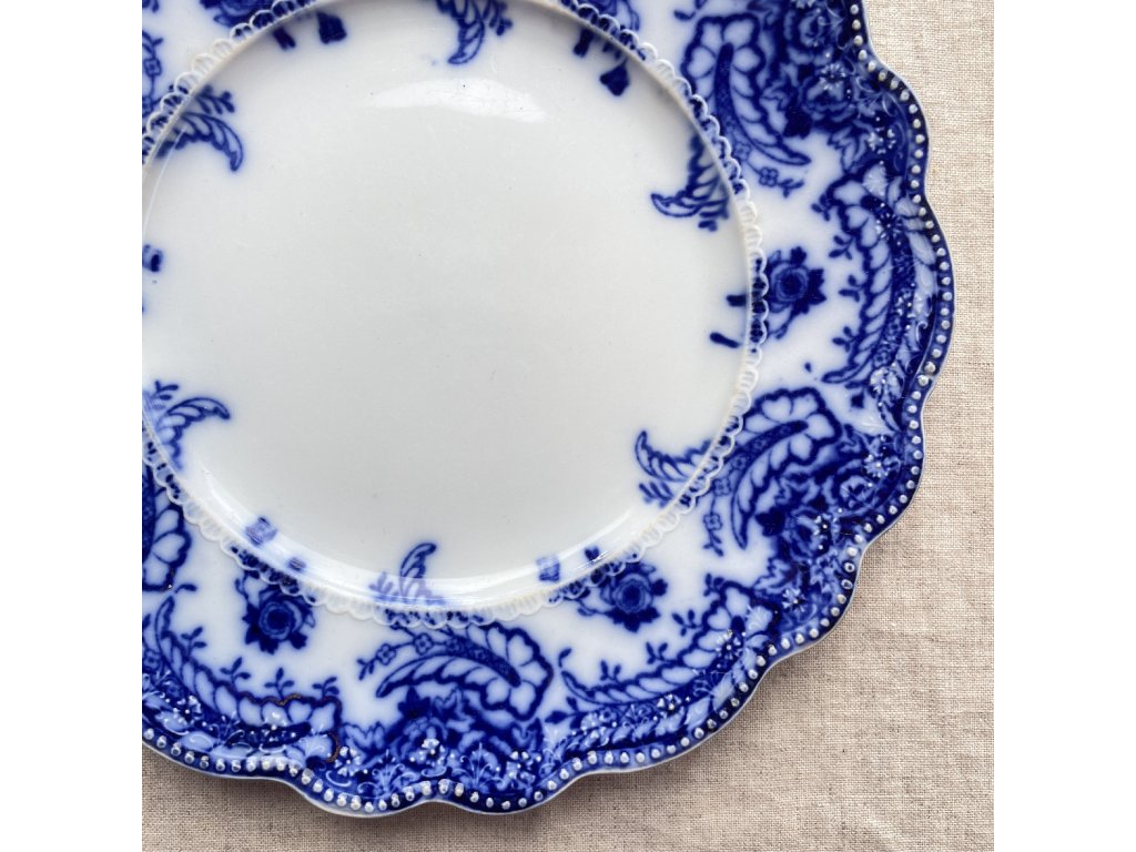 Široký lem je bohatě dekorován sytým kobaltově modrým dekorem s florálními a rostlinnými motivy, doplněnými stylizovanými listy a ornamentálními prvky připomínajícími krajkovou výzdobu.
