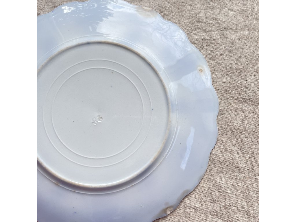Vnitřní plocha talíře je ponechána hladká a světlá, pouze jemně orámovaná tenkou dekorativní linkou, což vytváří elegantní kontrast mezi klidným středem a bohatě zdobeným okrajem.