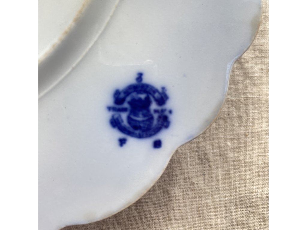 Na spodní straně se nachází podglazurní modrá značka v podobě heraldického znaku s korunou, doplněná iniciálami, jejichž provedení je částečně rozpitý a hůře čitelný.