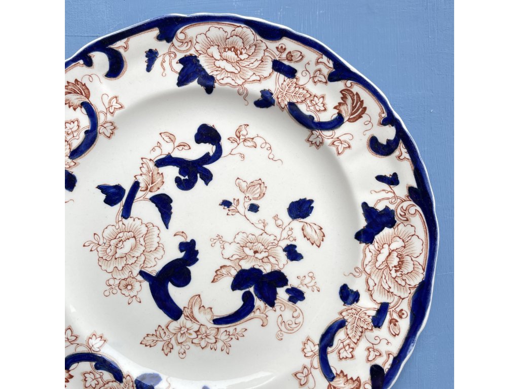 Dezertní porcelánový talíř s jemně zvlněným okrajem, zdobený bohatým květinovým dekorem v kombinaci kobaltově modré a teplé hnědočervené barvy.