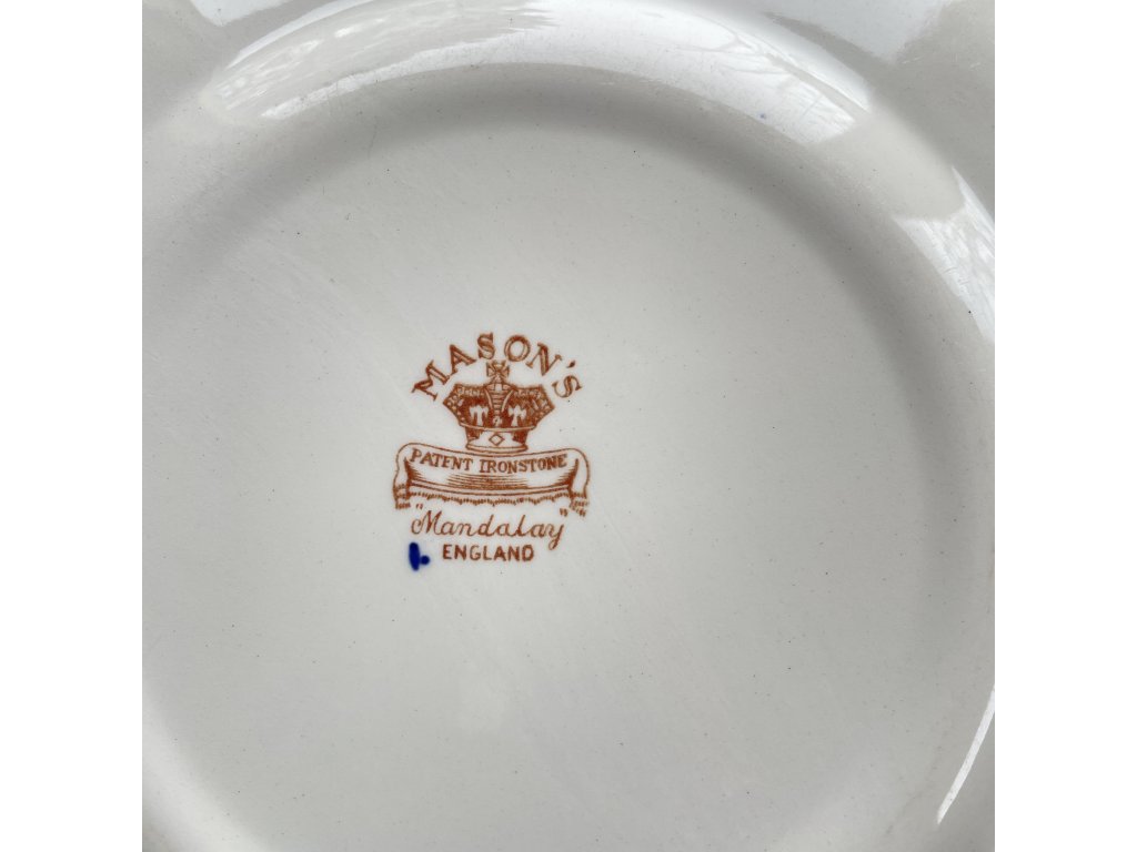 Značka Mason’s dekor Mandalay, značka potvrzuje výrobu u firmy Mason’s a řadí talíř do období přelomu 19. a 20. století, kdy byla ironstone keramika ceněna pro svou pevnost i dekorativní kvalitu.