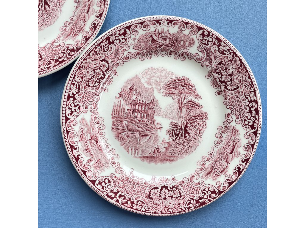 Je vyroben v tradičním anglickém transferovém stylu, typickém pro první polovinu 20. století, a proveden v sytě vínově červené barvě na krémově bílém podkladu.