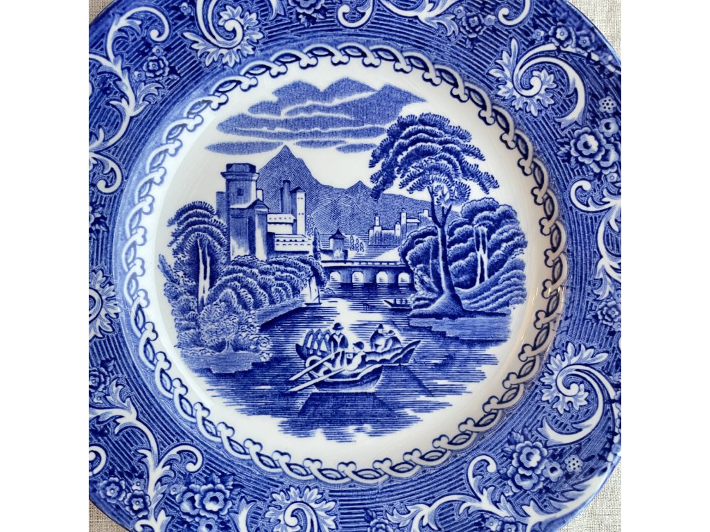 Střed talíře vyplňuje romantická krajinná scéna s řekou, loďkou, mostem a věží, zasazená do bohatě ornamentálního rámu s rostlinnými a rokokovými motivy, typickými pro tradiční anglický styl.