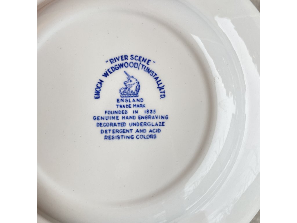Na spodní straně se nachází značka „River Scene – Enoch Wedgwood (Tunstall) Ltd., England“, která potvrzuje původ ve slavné keramické oblasti Staffordshire a datuje výrobu do 20. století.