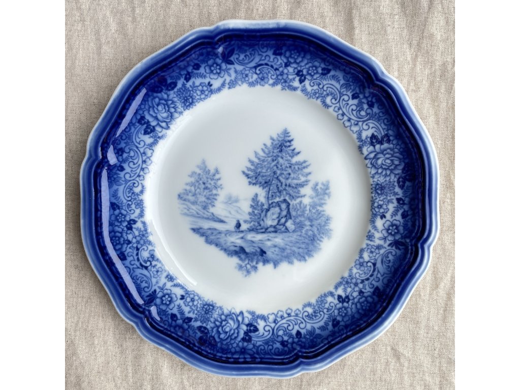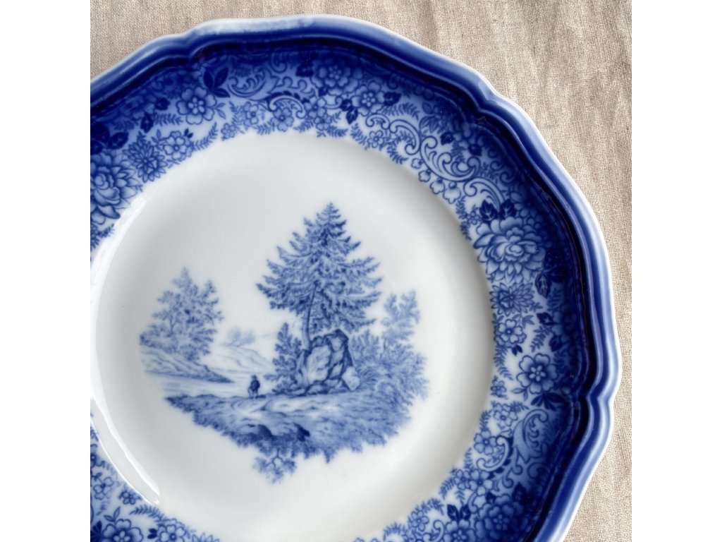 Ve středové části talíře je jemně provedená modrá krajinná scéna s jehličnatými stromy, balvanem a drobnou postavou v krajině, která působí romantickým a lehce historizujícím dojmem.