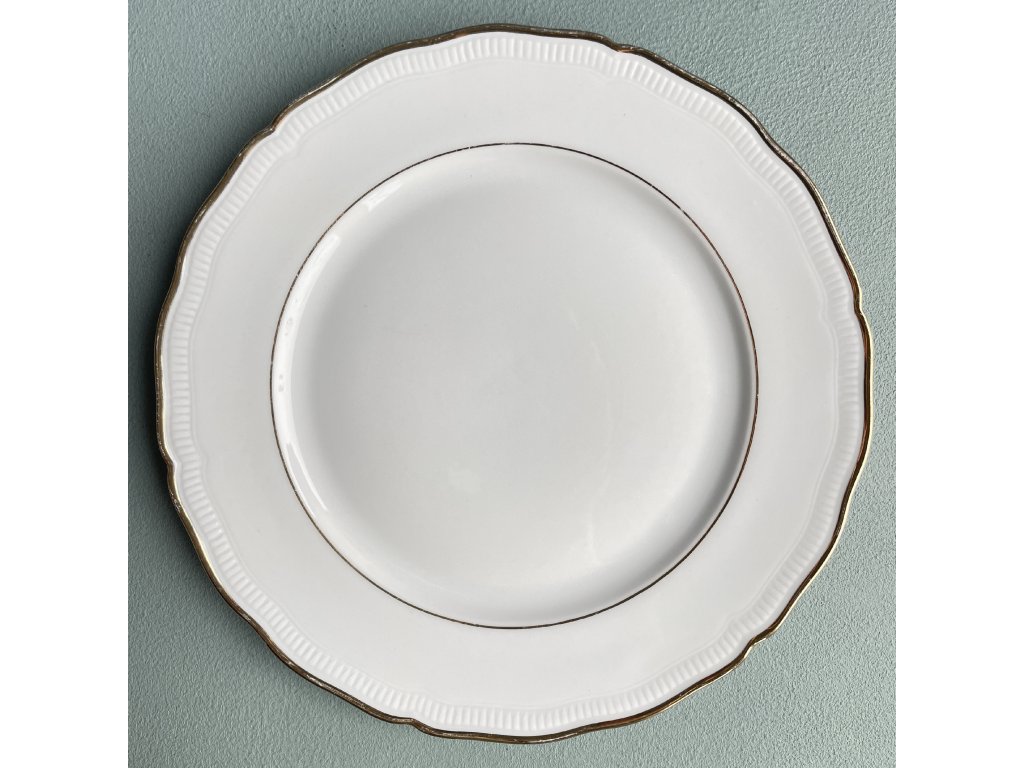 Talíř má jemně vlnitý okraj zdobený zlatou linkou, která se objevuje i v jeho vnitřní části.
