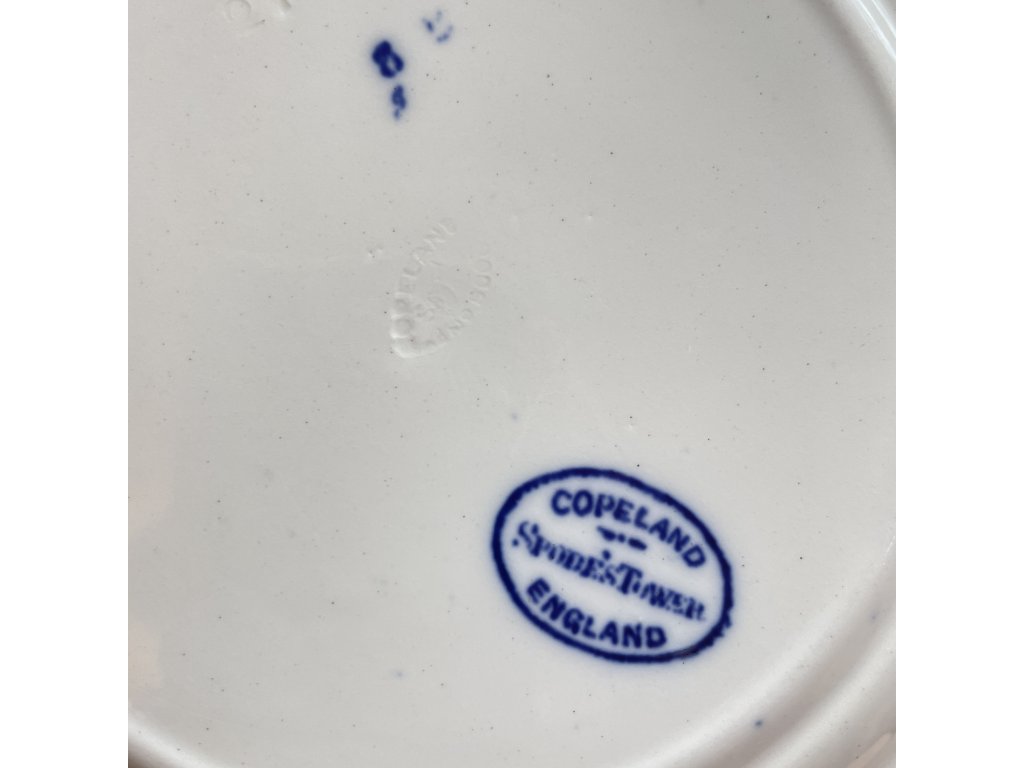 Na spodní straně talíře je značka COPELAND SPODE’S TOWER ENGLAND v modrém oválu, která potvrzuje původ a zařazuje výrobu pravděpodobně do první poloviny 20. století.