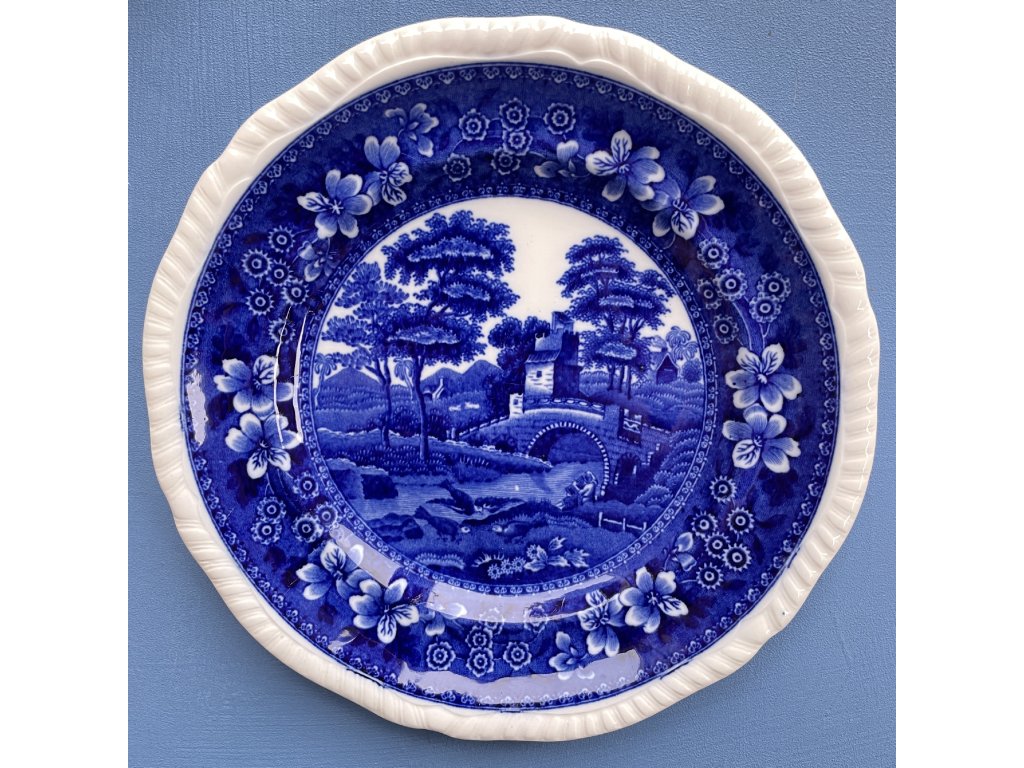 Talíř má jemně zvlněný okraj s plastickým žebrováním a bohatým florálním rámováním, které orámuje středovou scénu zobrazující romantickou krajinu s mostem, stromy, vodní hladinou a zříceninou věže – typický výjev inspirovaný anglickou pastoralní krajinou 19. století.