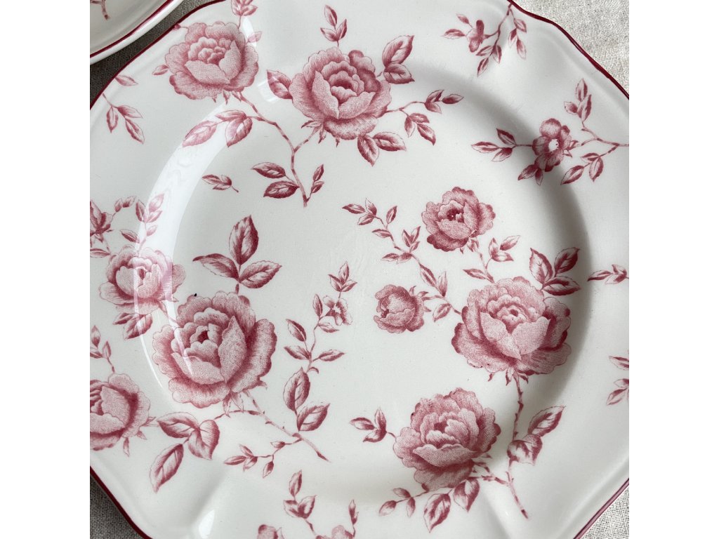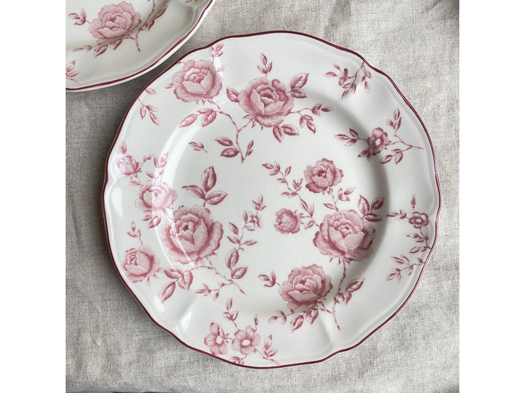 Krémově světlý podklad je zdoben růžovými růžemi v klasickém anglickém stylu, doplněnými decentním vlnitým okrajem s tmavě růžovou linkou, která dodává talíři elegantní zakončení.