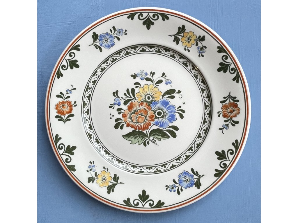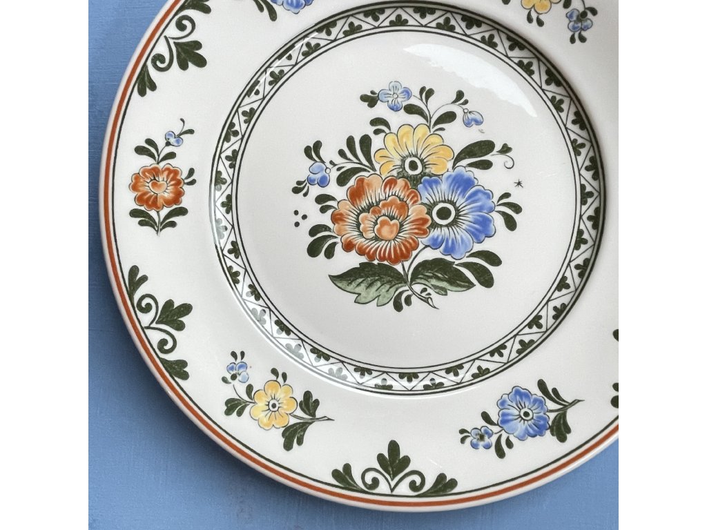 Okraj je lemován dvojitou linkou – tmavě zelenou a výrazně oranžovou – což celému talíři dodává elegantní, přesto však domácký rustikální vzhled.