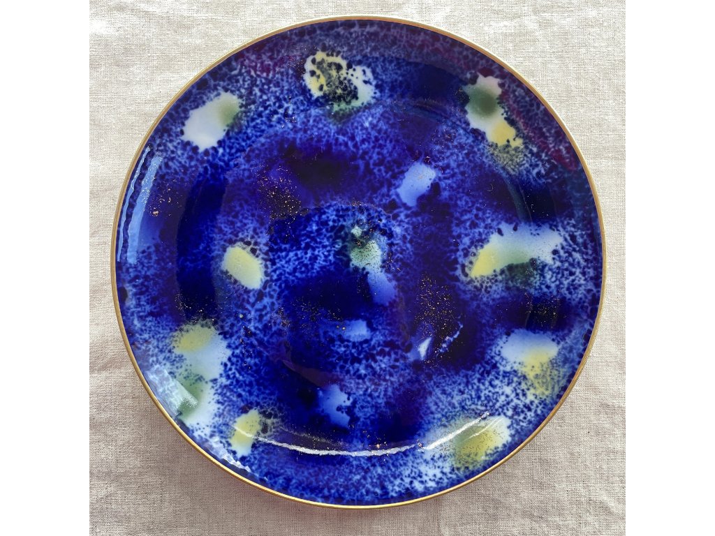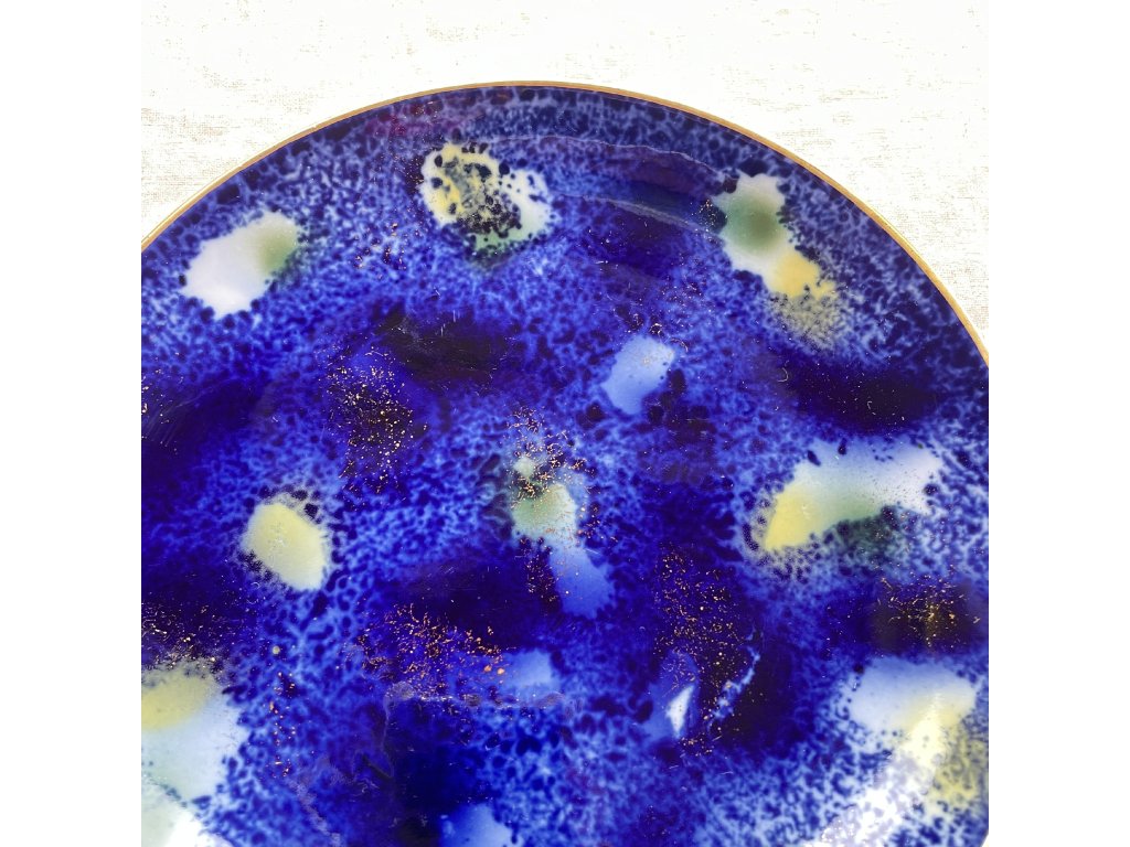 Porcelánový dezertní talíř s abstraktním dekorem v hlubokých odstínech kobaltové a ultramarínové modři, které se prolínají s jemnými přechody do světlejších tónů, místy doplněnými nazelenalými a zlatými akcenty.