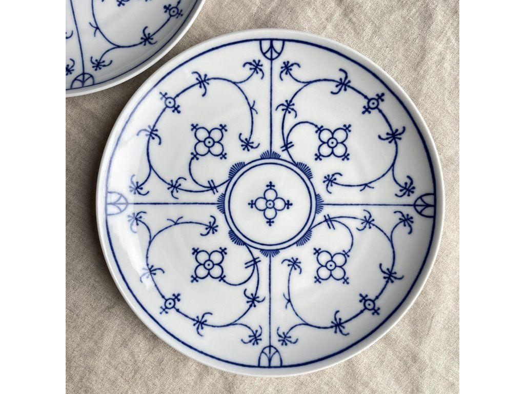 Dezertní talíř je vyroben z kvalitního bílého porcelánu a zdoben tradičním modrobílým dekorem známým jako „cibulák“ (Zwiebelmuster).