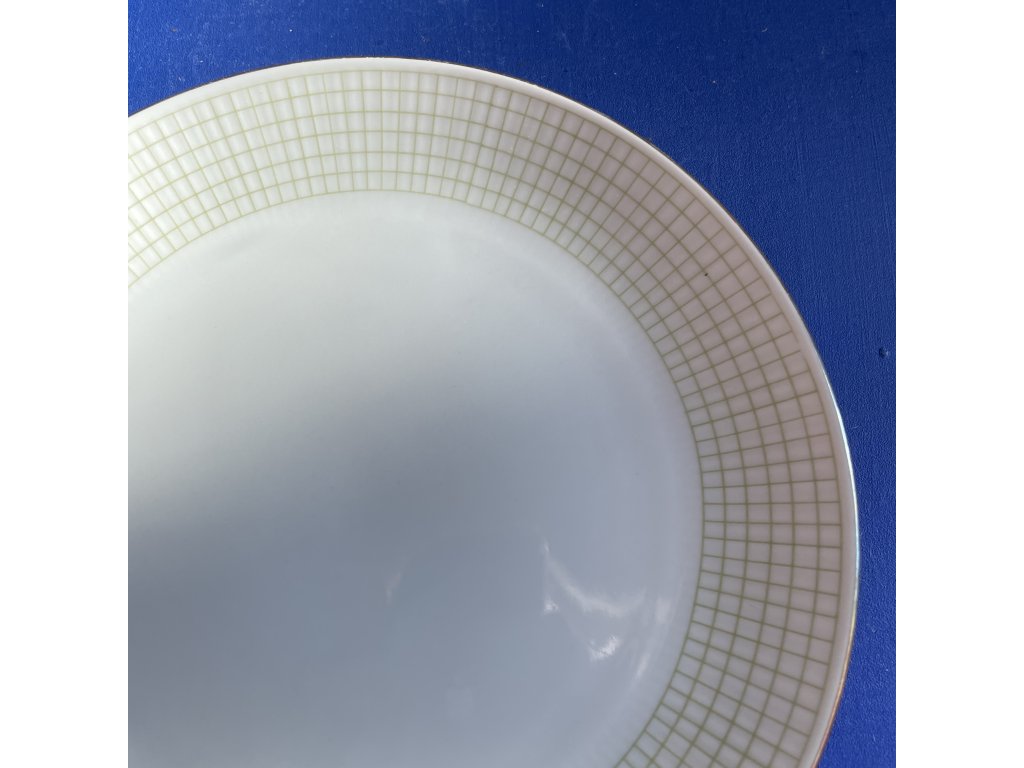 Dezertní talíř bílé barvy dekorem zelené kostky po obvodu. Obvod talíře je zdoben i jemným relíéfním dekorem.