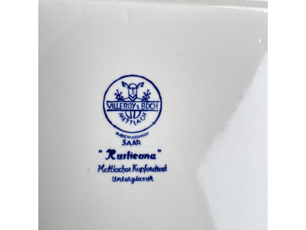 Značení na spodní straně s nápisy „Made in Germany“, „Saar“, „Rusticana“, „Mettlacher Kupferdruck“ a „Unterglasur“ potvrzuje původ i použitou výrobní techniku a řadí tento kus do druhé poloviny 20. století.