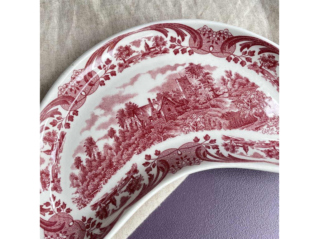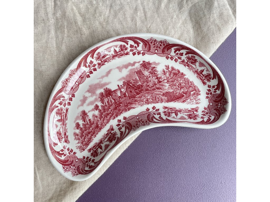Talířek ve tvaru ledvinového oblouku, známý také jako "bone dish" nebo "kidney dish", pochází z Anglie a je krásně zdoben technikou přenosového tisku v červené barvě.